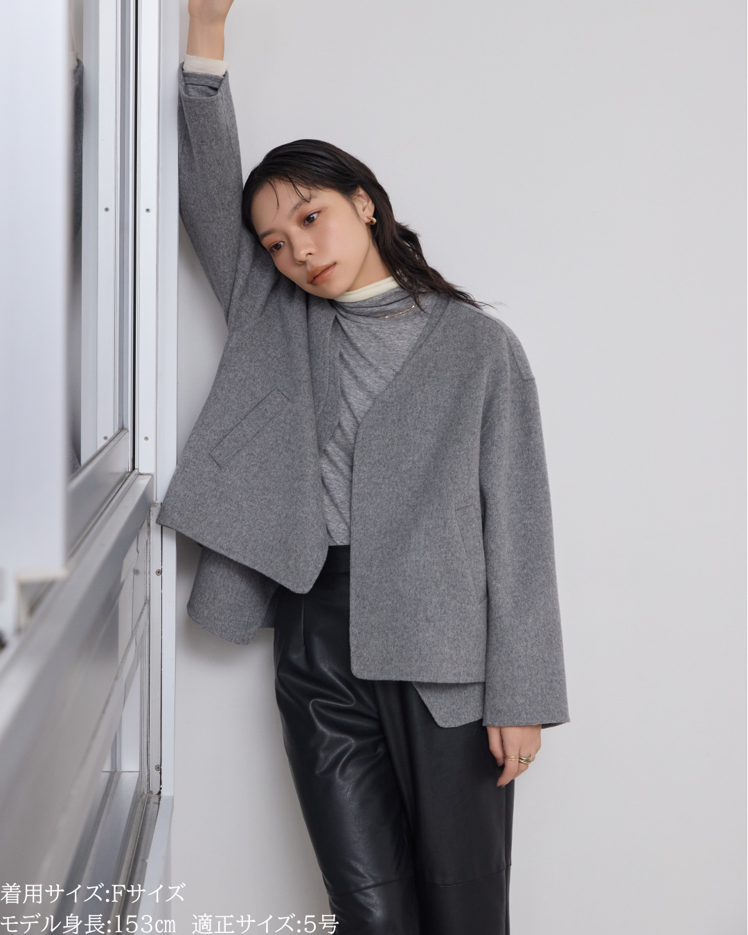 ショートコートは小柄さん仕様にウエスト位置を高めに切り替え、脚長効果を演出。