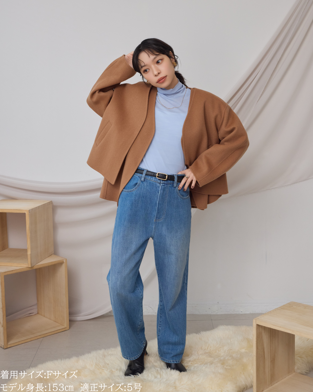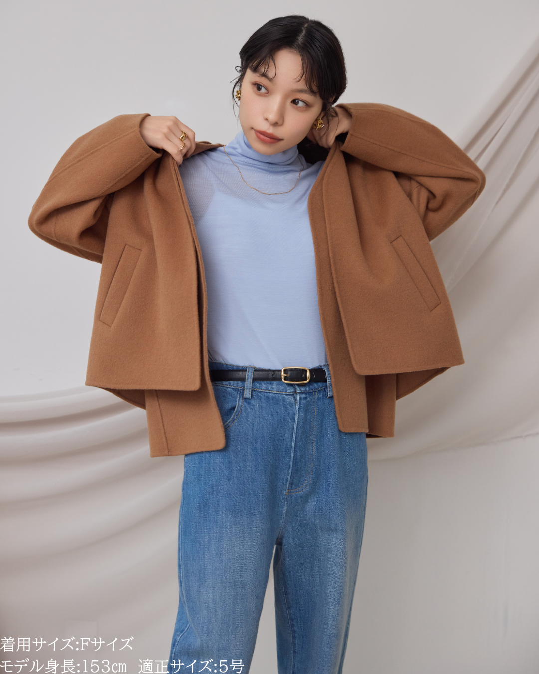 シンプルなショートコートはデニムからスカートまで幅広く合わせやすく、オンオフ問わず活躍。