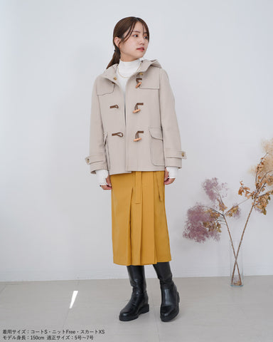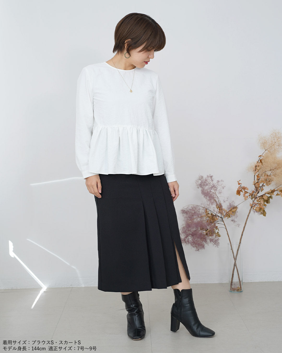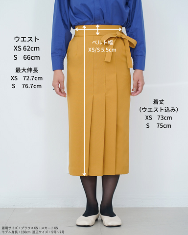 (S/画像)全体的にジャストサイズです。プリーツは下半分からデザインされているため、トップスをアウトしてもデザインが損なわれず、オシャレ見えします。腰回りの張りも気にならず細見え効果があると思いました。