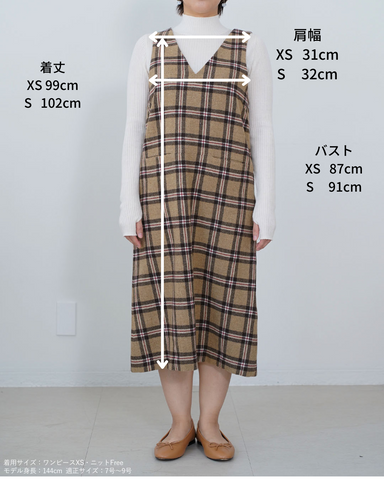 (S/右)全体的にゆとりがあり、屈んだ際など肩紐が落ちやすいと感じました。着丈は丁度良いです。