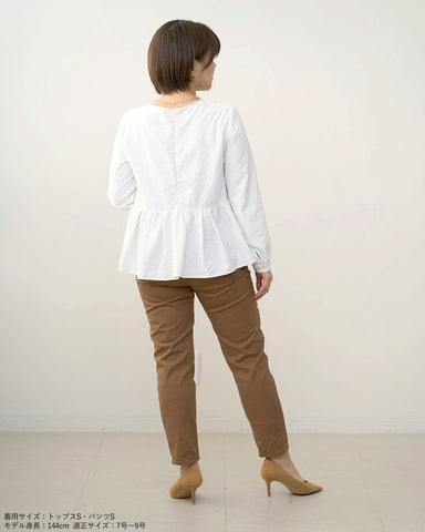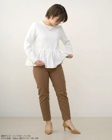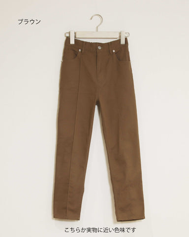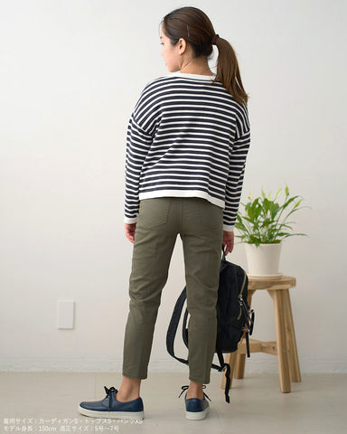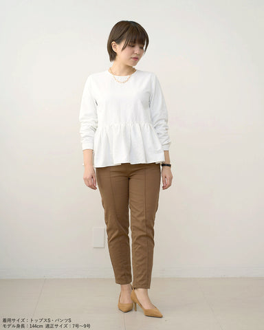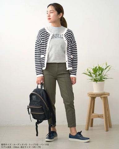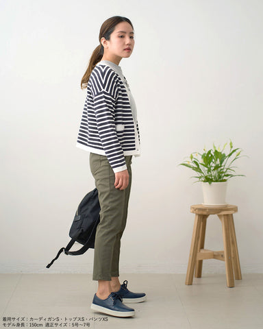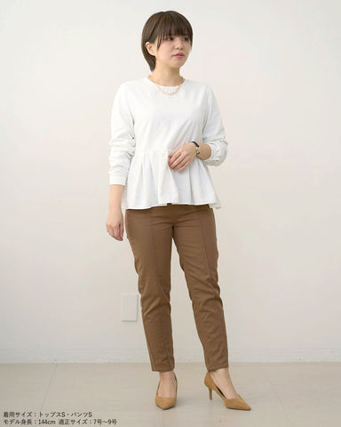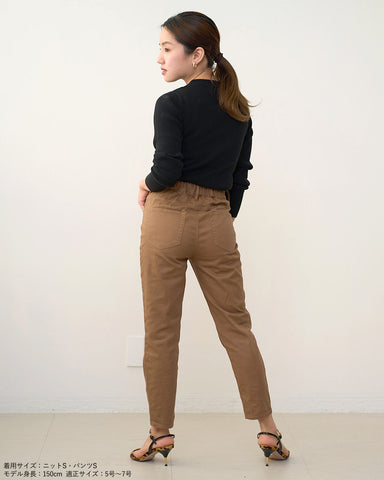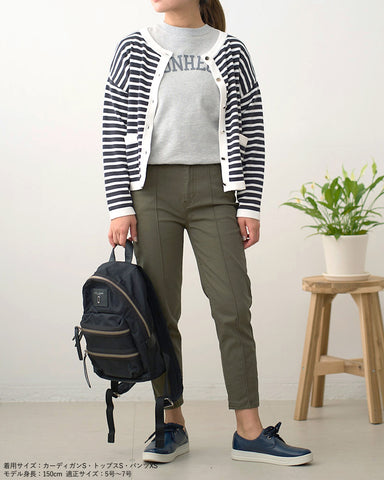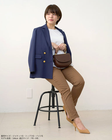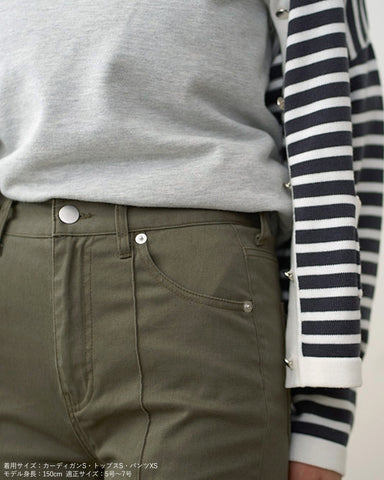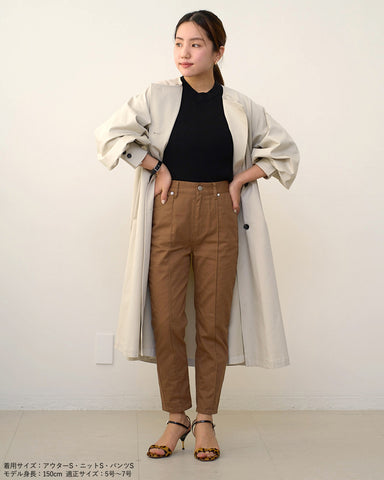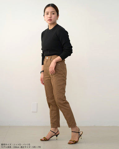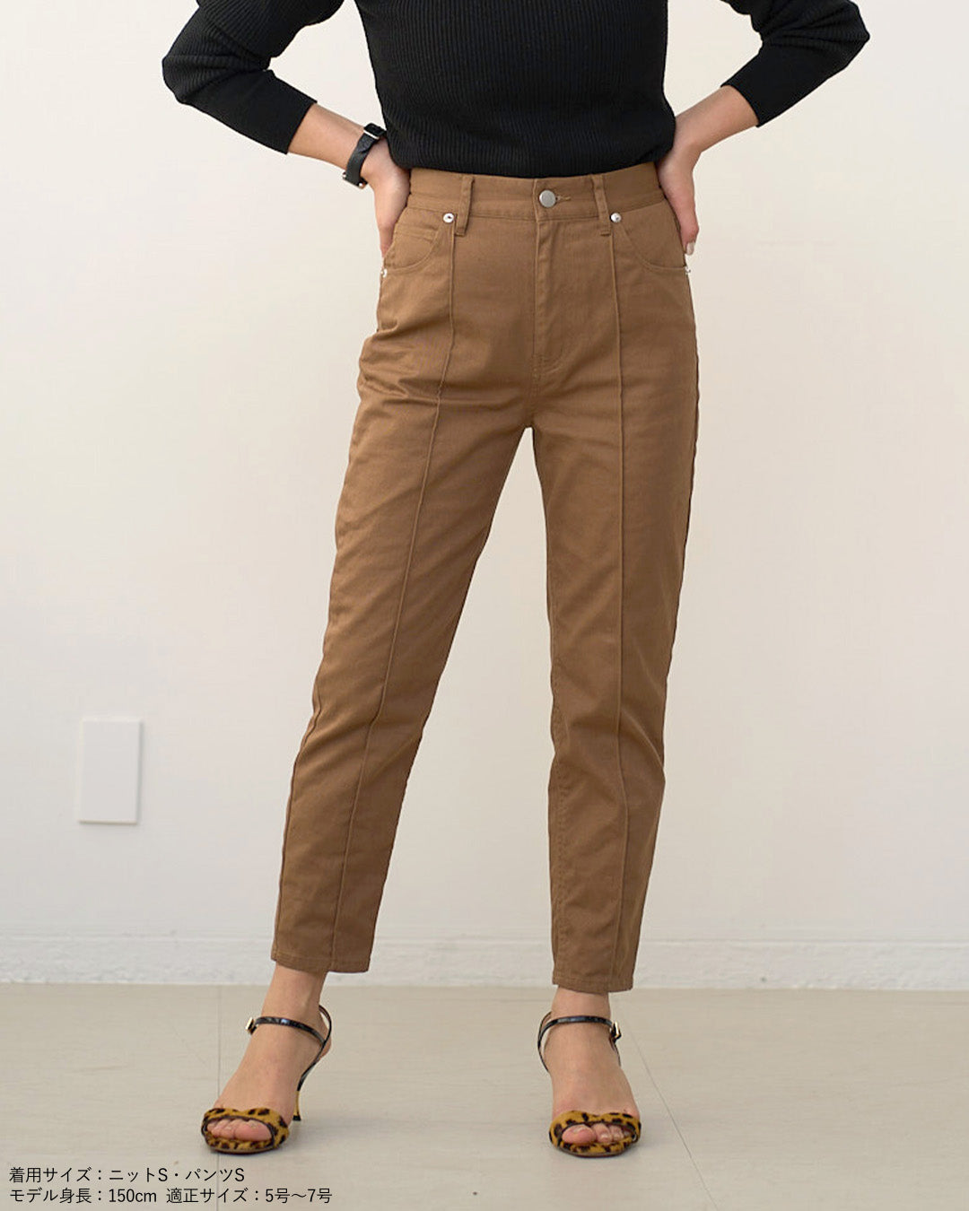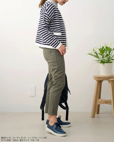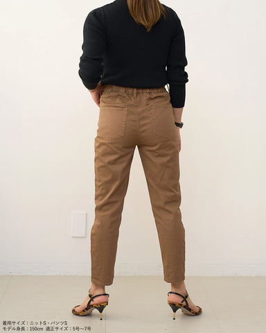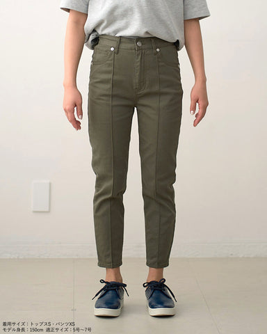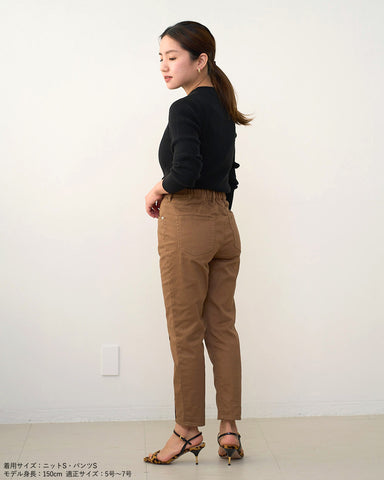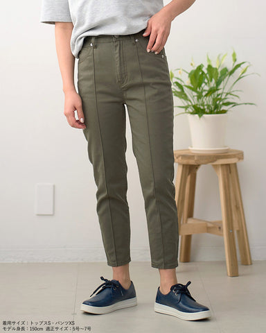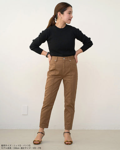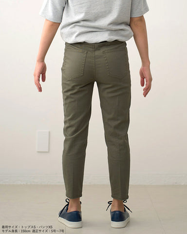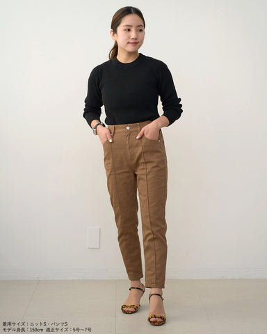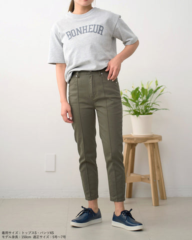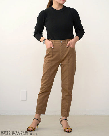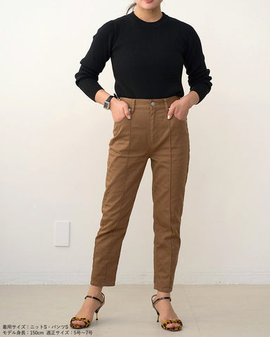 大人気で完売したセンターピンタックパンツを、さらに足が美しくみえるようアップデートし、再登場です! ■Design大人気だったセンターピンタックパンツの股上寸法を程よく浅めに(股ぐりに余りなくフィットすることで、股下ラインがより長く見えます。)調整し、ヒップまわりには少しゆとりを持つことで、より履きやすく、美しいシルエットに改良いたしました。 ピンタックで縦長ラインを強調し、美脚効果もUP!小柄女性のくるぶしがきれいに見えるクロップド丈に設定。スニーカーにも、サンダルにもキレイに履いていただけます。 ストレッチも効いているので、普段着としてもガシガシ使えて、ジャケットを合わせればキレイ目スタイルにも◎。 すでにご愛用の方も、ぜひシルエットの違いをご実感ください。 ■Fablic横に伸縮性の高い生地を使っているため、履き心地が抜群です。 ご自宅で洗濯機洗いが可能です。 ■Coordinateトップスは何にでも合わせやすく、万能なパンツです。