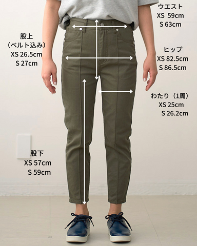 (XS/左)クロップド丈なのでくるぶし上の綺麗な丈感です。ウエスト64㎝の私でもキツさはございません。やや伸縮性のある生地の為動きやすいと思いました。股上がそんなに深くないですがしゃがんだ時に下着が見える心配もございません。