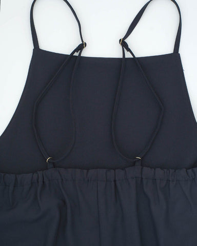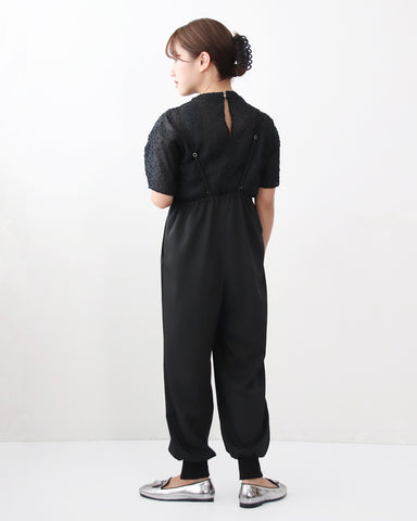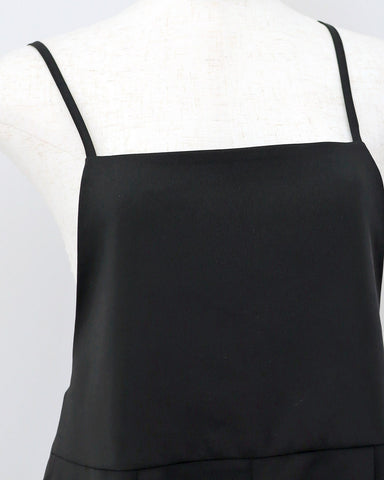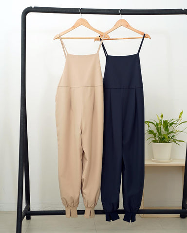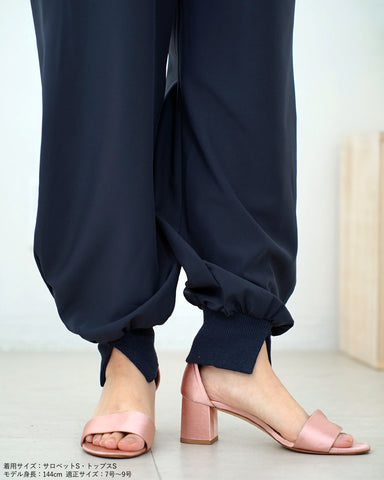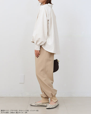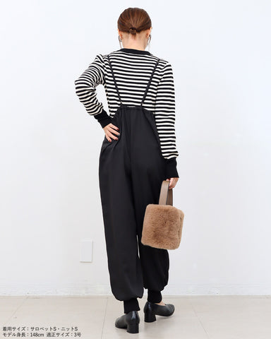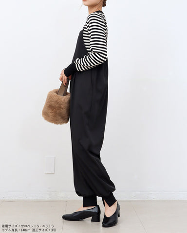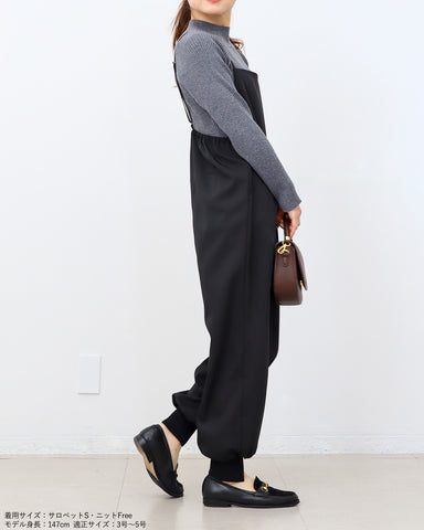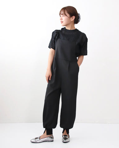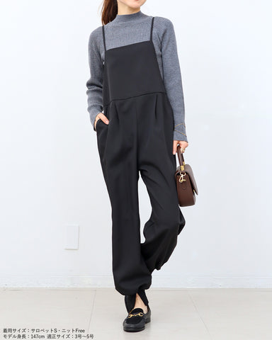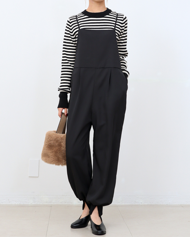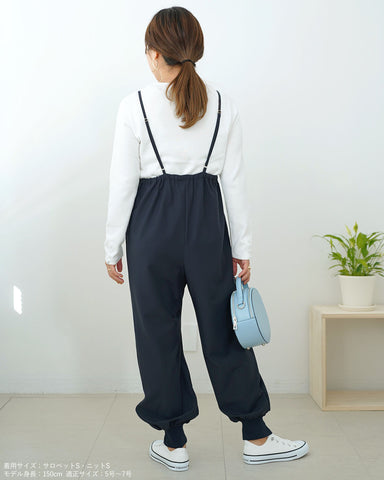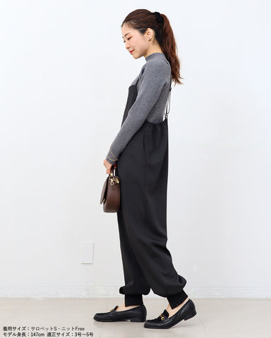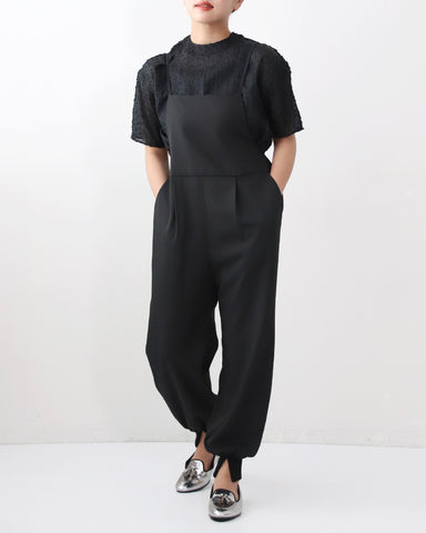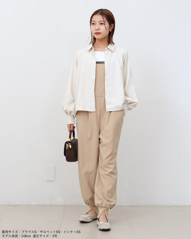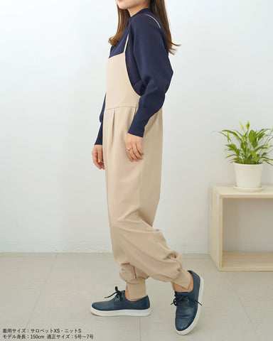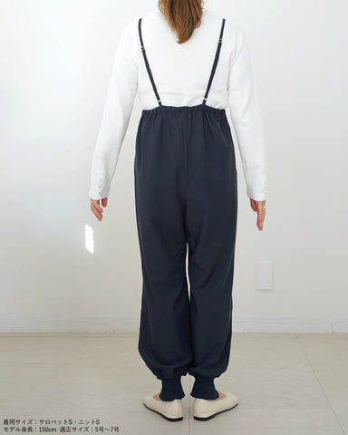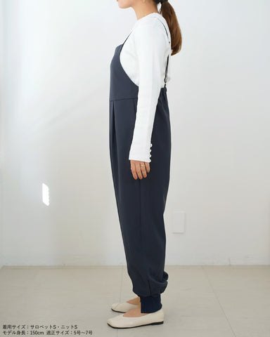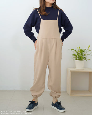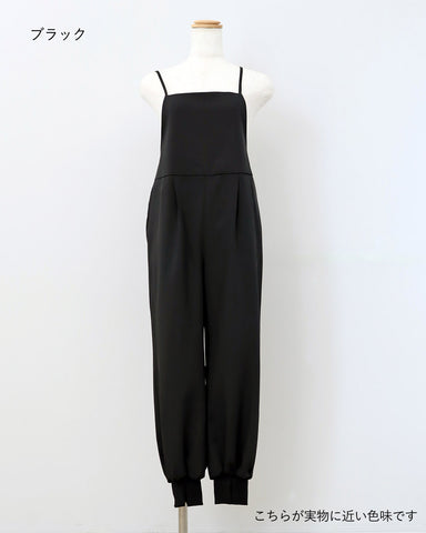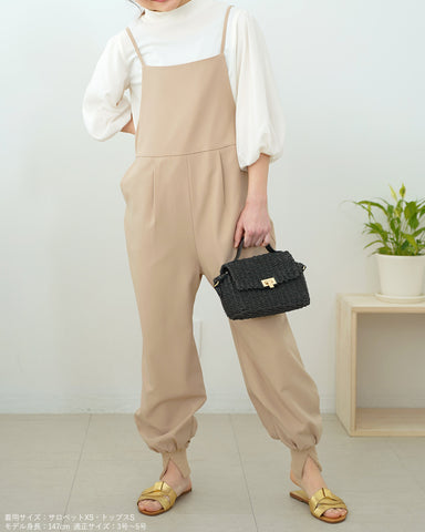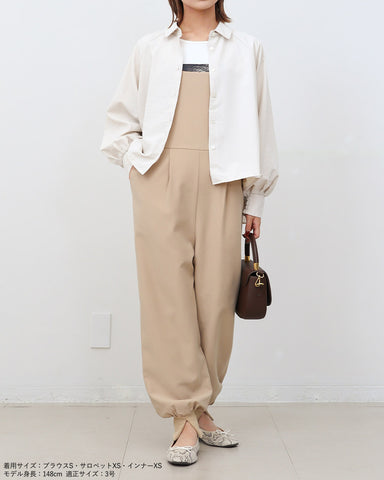 ジョガーパンツというカジュアルアイテムを、華奢な肩紐のディティール、そしてとろみのある素材でレディーライクなサロペットにしました。