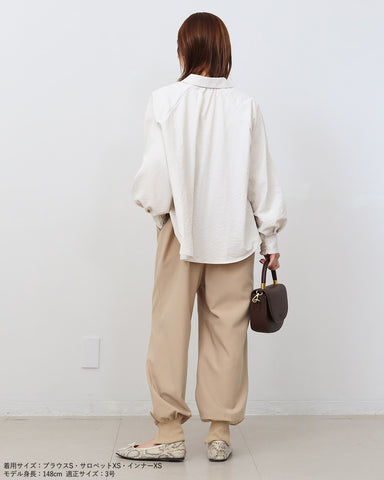 後ろがオールゴムなので締め付け感がなく、軽やかな生地のため長時間快適にお過ごしいただけます。着脱簡単で忙しい朝にもおすすめ。適度なゆとりがあるため、ボディラインを拾いにくいシルエットです。