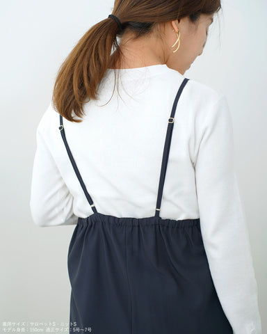(XS/左)肩紐を長めにして可愛く着用可能です。私は肩がしっかりあり、撫で肩ではないので、長めに設定しても肩紐が落ちてくる感じはありませんでした。当て布をバストトップより15cmほど高めの位置に設定しますと少々着丈が足りないので、当て布を高めの位置でも着用する場合はSサイズを選んだ方が良さそうです。
