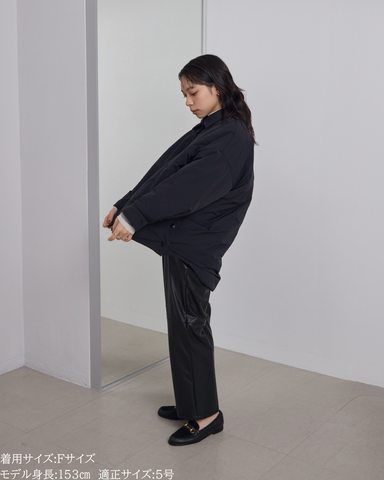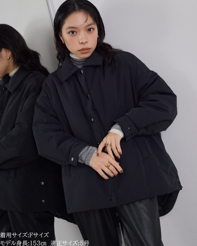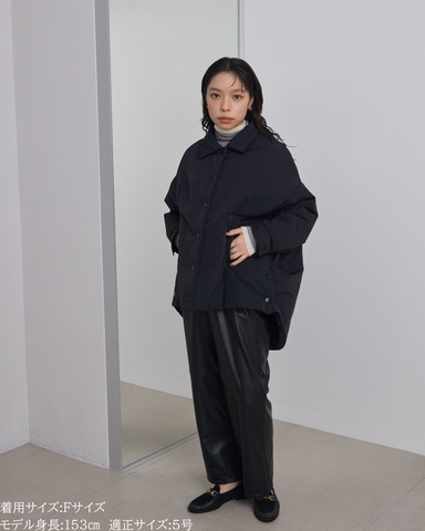 (F)袖丈は親指が少し見える長さです。後ろ着丈が長めでおしりをすっぽりと隠してくれるシルエットのため寒い日でも暖かく着られます。身幅はゆとりがあり、ニットを着ても着膨れしなさそうです。ボリューム感はありながら軽いコートでしっかり防寒対策できるアイテムです。
