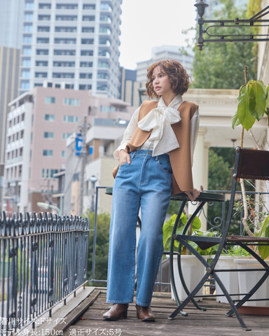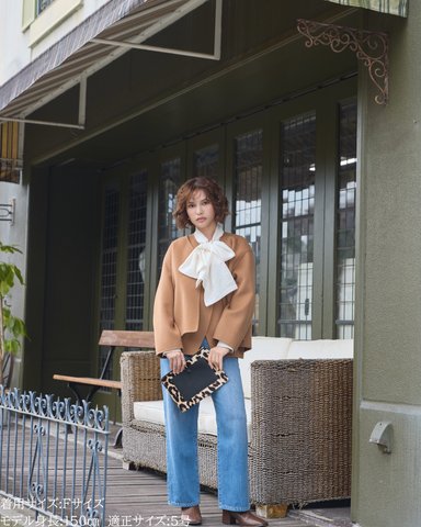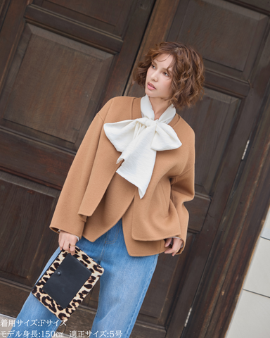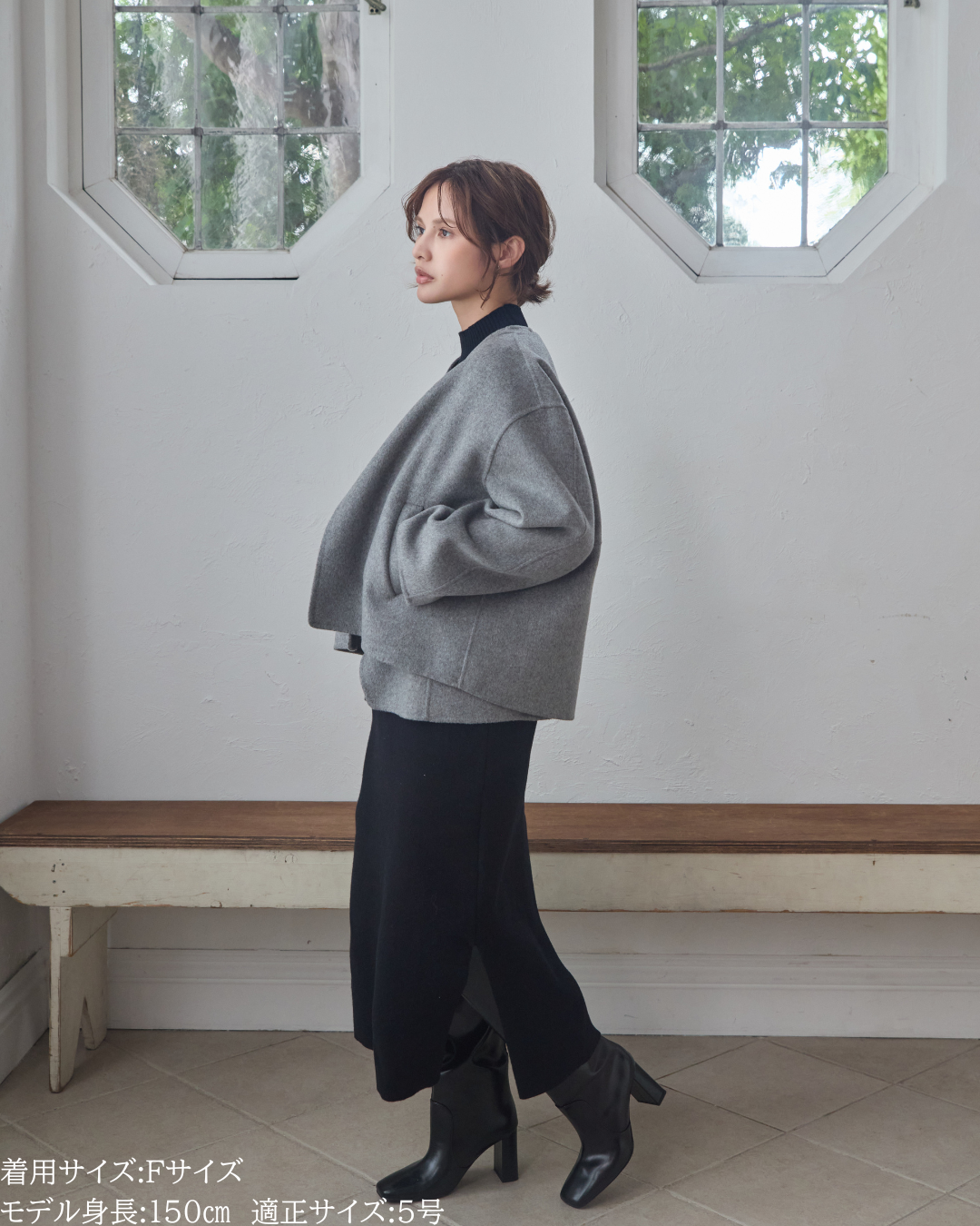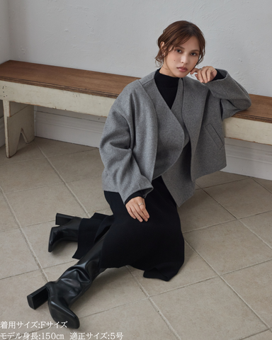 ショートコートは小柄さん仕様にウエスト位置を高めに切り替え、脚長効果を演出。