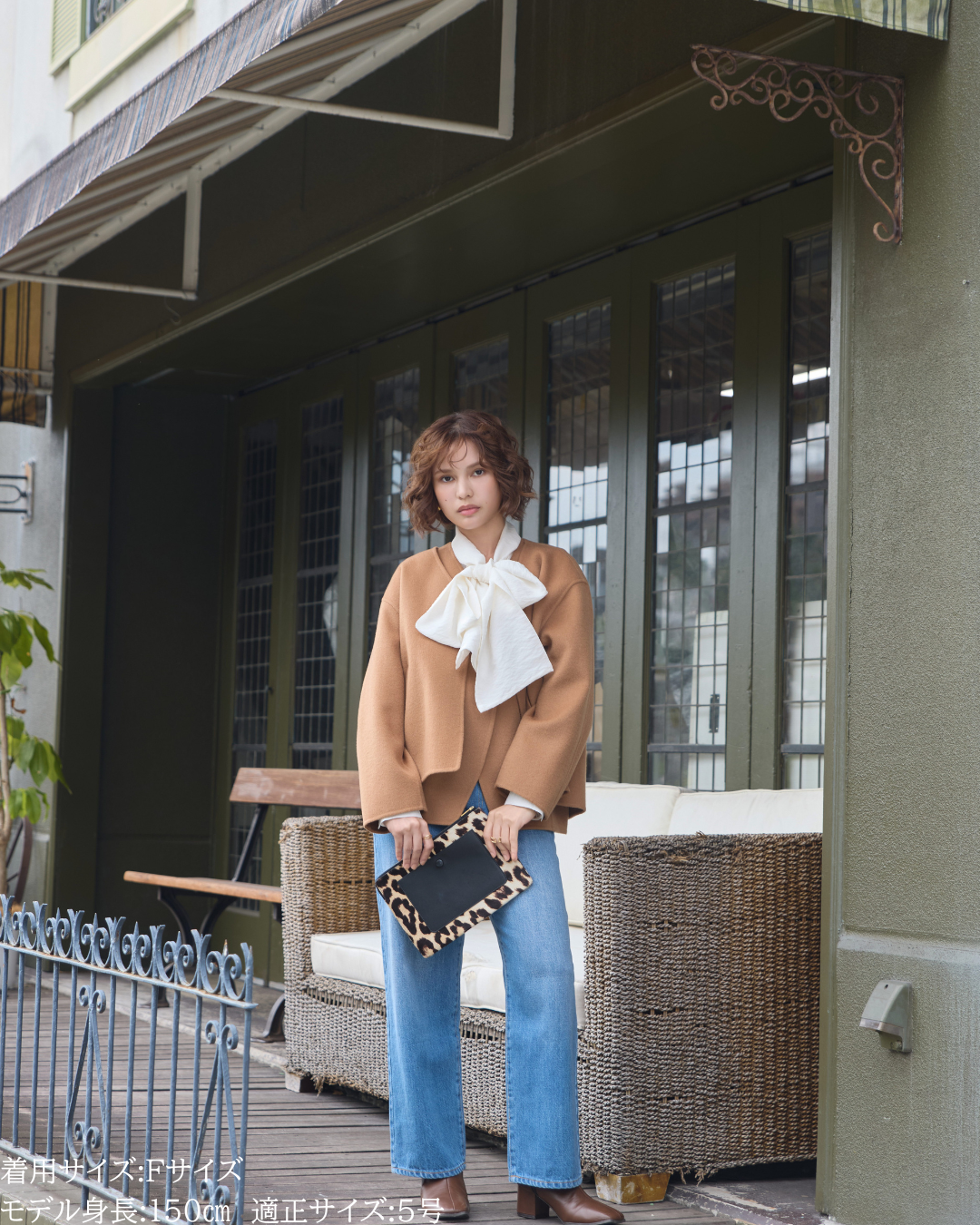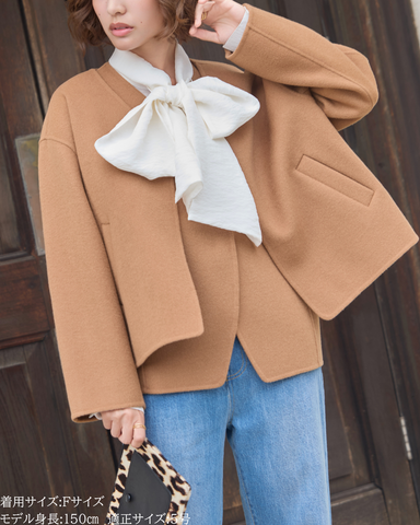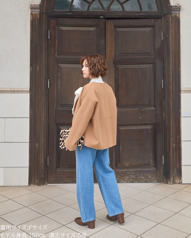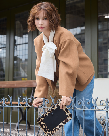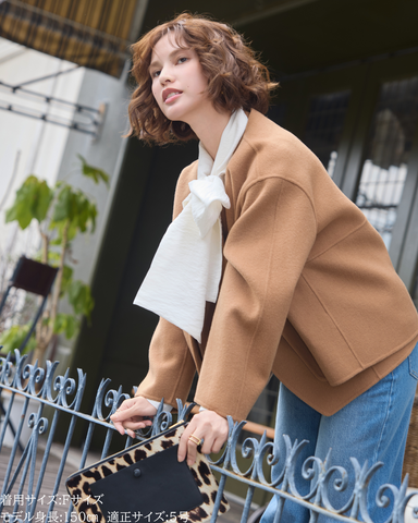 シンプルなショートコートはデニムからスカートまで幅広く合わせやすく、オンオフ問わず活躍。