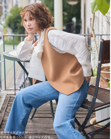 ベストはニットやブラウスに重ねて室内でもおしゃれなレイヤードに。