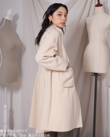 モッズコートの形をベースに、ウール素材を使い、メンズっぽさを敢えて残したマニッシュコート。メンズライクなかたちとは対照的に、アイボリーの優しい色味とビーバー仕上げの柔らかい風合いが女性らしさのある1着に。デザインのポイントでもある、立体パッチポケットでチャーミングさをプラス。すぽっと被るだけの独立したフードは取り外し可能なので、マフラーのように寒い時は防寒としても使え、雰囲気など変えたいときは、外していただいても◎モッズコートの形を生かしているため、裾はフィッシュテールデザインに。ウエストには内側で、調整ができるようにドロストを仕込むことによって、きゅっと絞れる仕掛けを作りました。フードの取り外しに加え、ウエストの形のシルエットを変えることで、2つのデザインを楽しめるようになっております。袖口はスナップボタンにて、サイズ調整可能。前立ては、ファスナーとスナップボタンでしっかり締まるので、防寒対策もバッチリなコートとなっております。