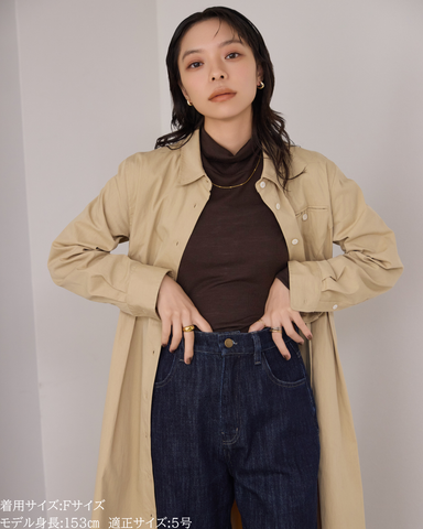 (F)丈は足首あたり、袖は親指がすっぽり隠れる長さです。腕を捲っても、袖口をひと折りしても格好良く来られると思います。普段9号サイズの私でも体のラインを拾わず、すっきりと着ることができます。