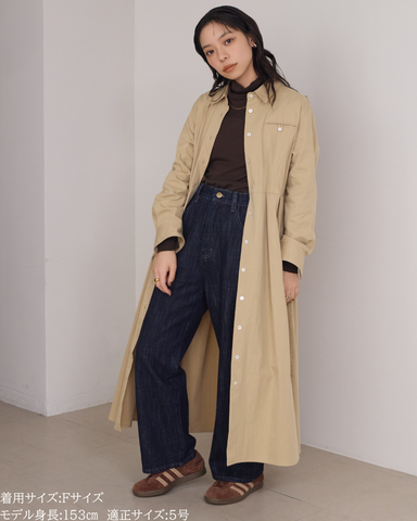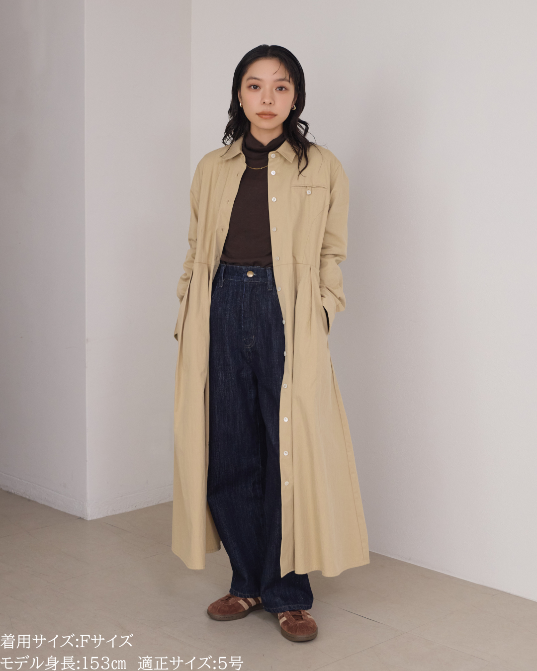 (F)身幅ジャストサイズです。袖丈は親指の付け根にかかるくらい(私は身長に比べ腕が長いタイプ)着丈は足首スッキリと出る丈になり、フラットシューズに合わせても引きずる心配もシューズに干渉する心配もない丈感です。ハイウエストの位置がさりげなくシェイプされていることでカジュアルな印象に寄りがちなシャツワンピがレディライクになり1枚でコーデが決まるワンピです。少し張りのある素材ですが前後の計算されたタックの効果により、絶妙な立体感が出ることで気になるお腹周りも自然にカバーされるスタイルアップワンピです。