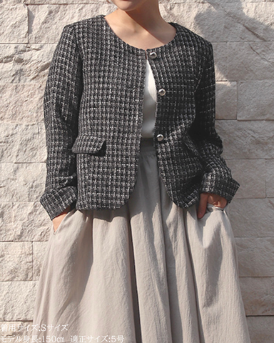 華やかなモノトーンのツイード素材を活かして、ややワイドノーカラーなシルエットはクラシック過ぎず、スマートな印象を演出してくれます。