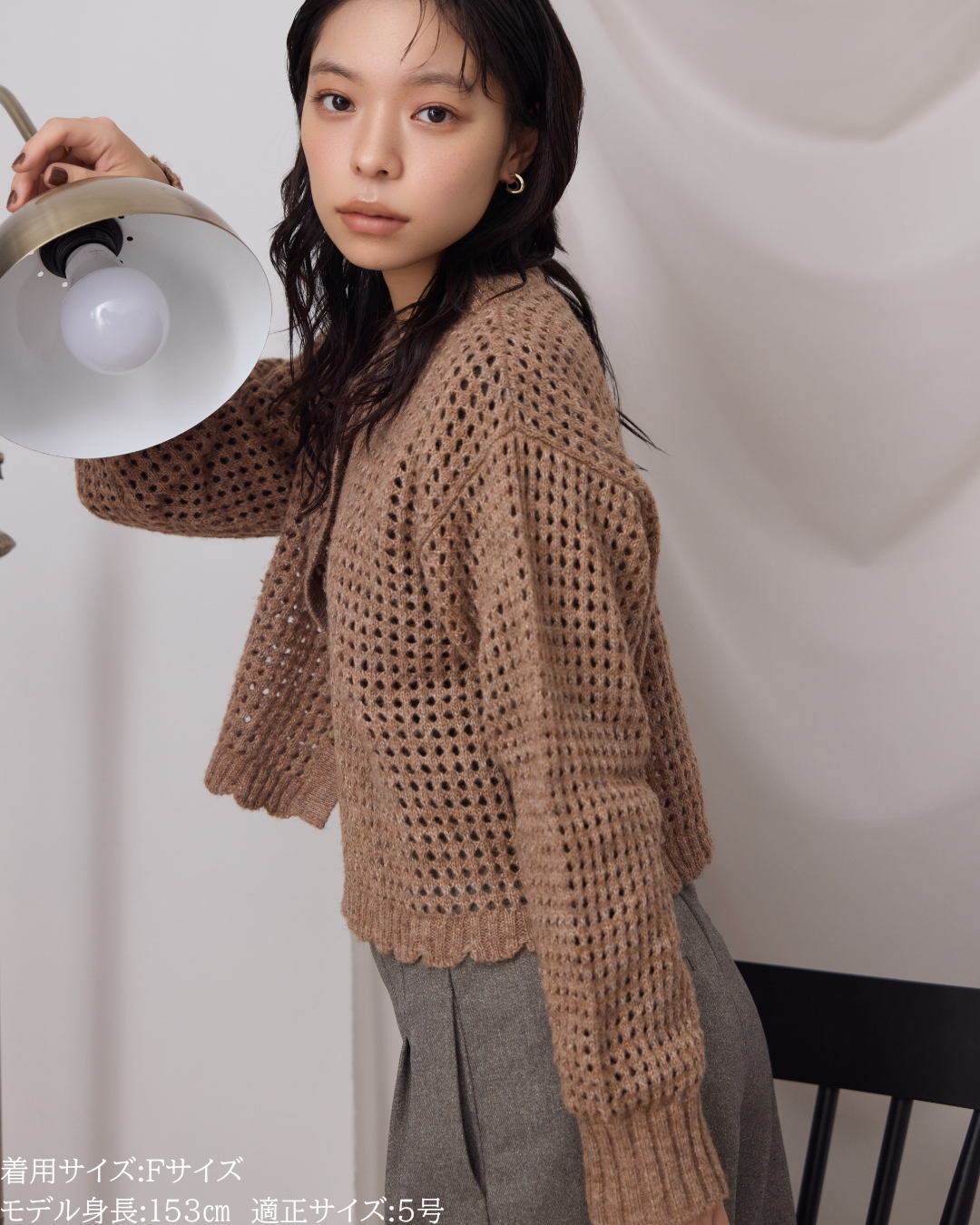 メッシュのようなモチーフを編み込み、ざっくり編みで程よくシアー感があるため、インナー見せコーデがスタイリッシュに決まります。