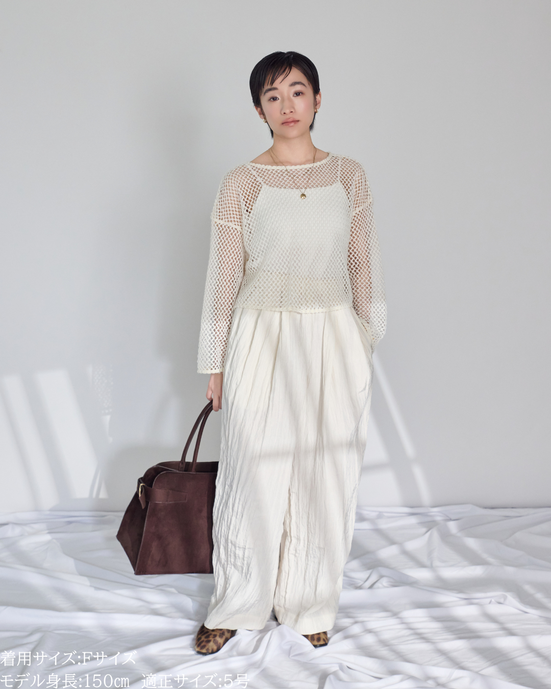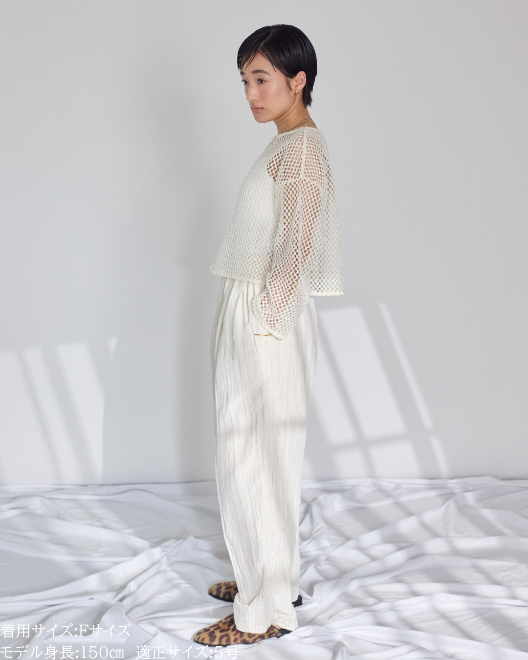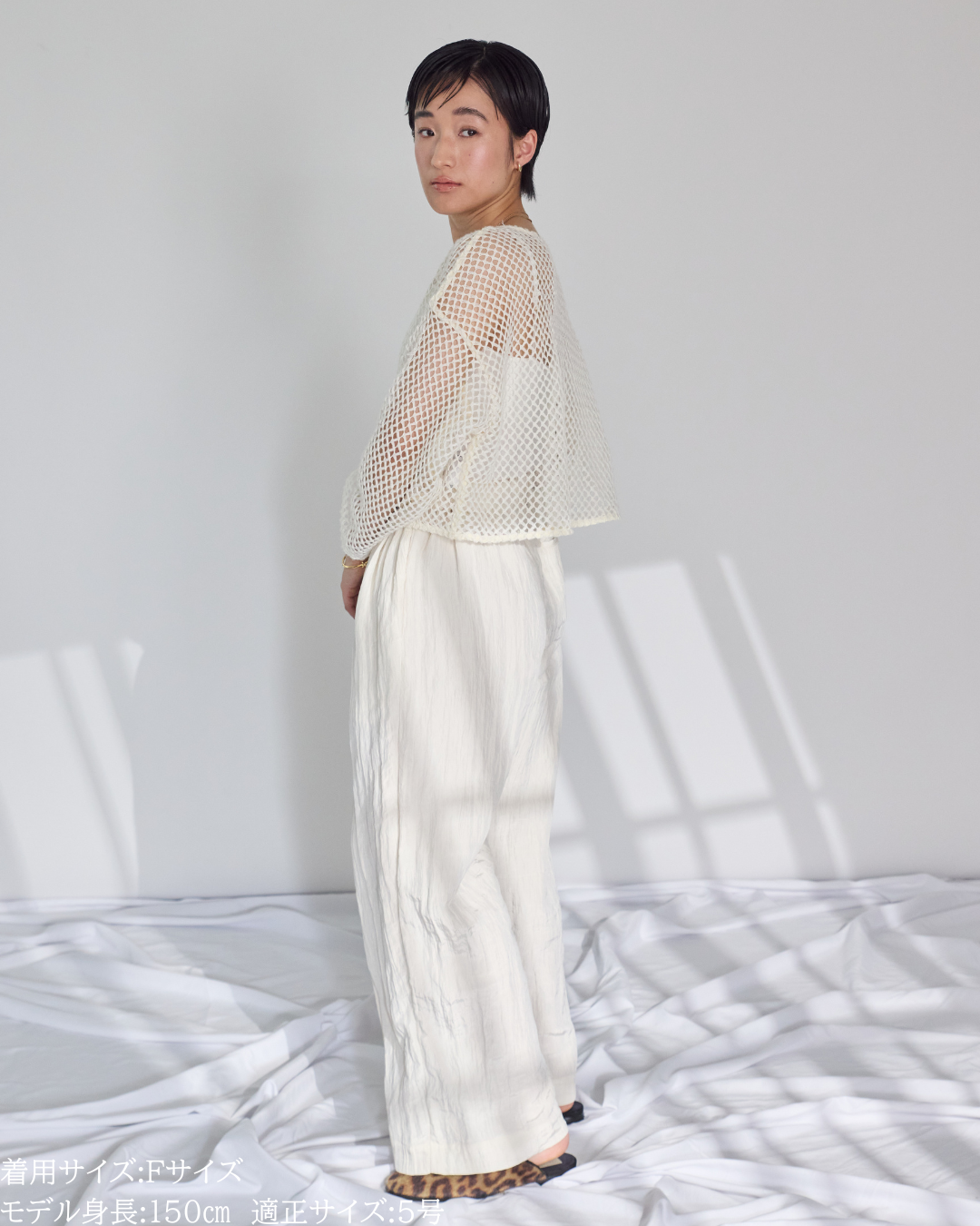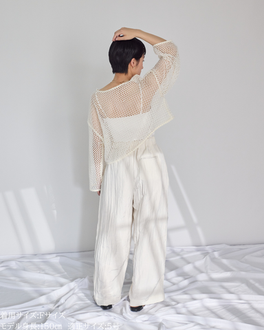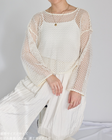 (F)袖丈は手首がしっかりと隠れ親指の付け根に少しかかるくらいのたっぷりとした丈感です。首元は鎖骨が見え隠れするリラクシーな開きとなります。少し荒目のメッシュから覗く素肌が抜けがありかっこいいです。丈は短めなので、ハイウエストのボトムスに合わせるのはもちろんのこと、あえてインナーを出してレイヤードを楽しむのもオススメです!