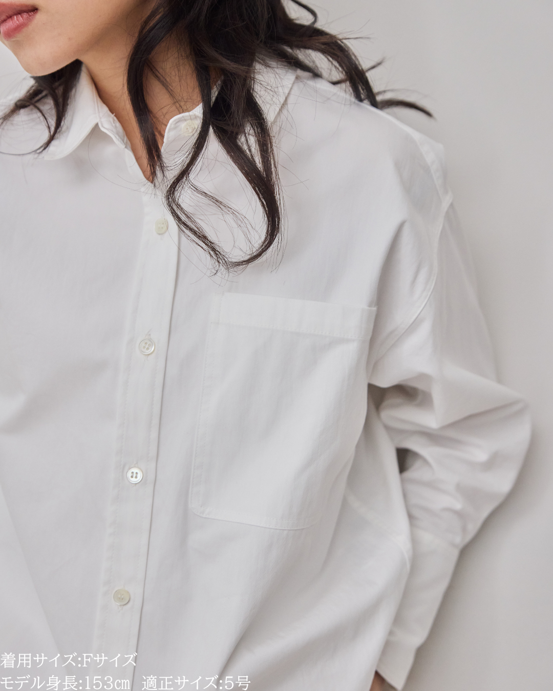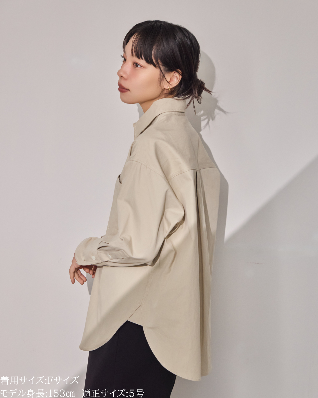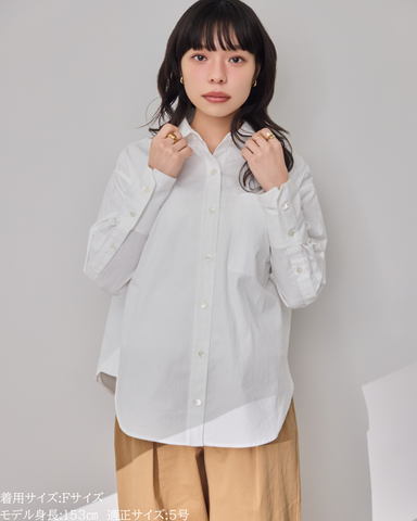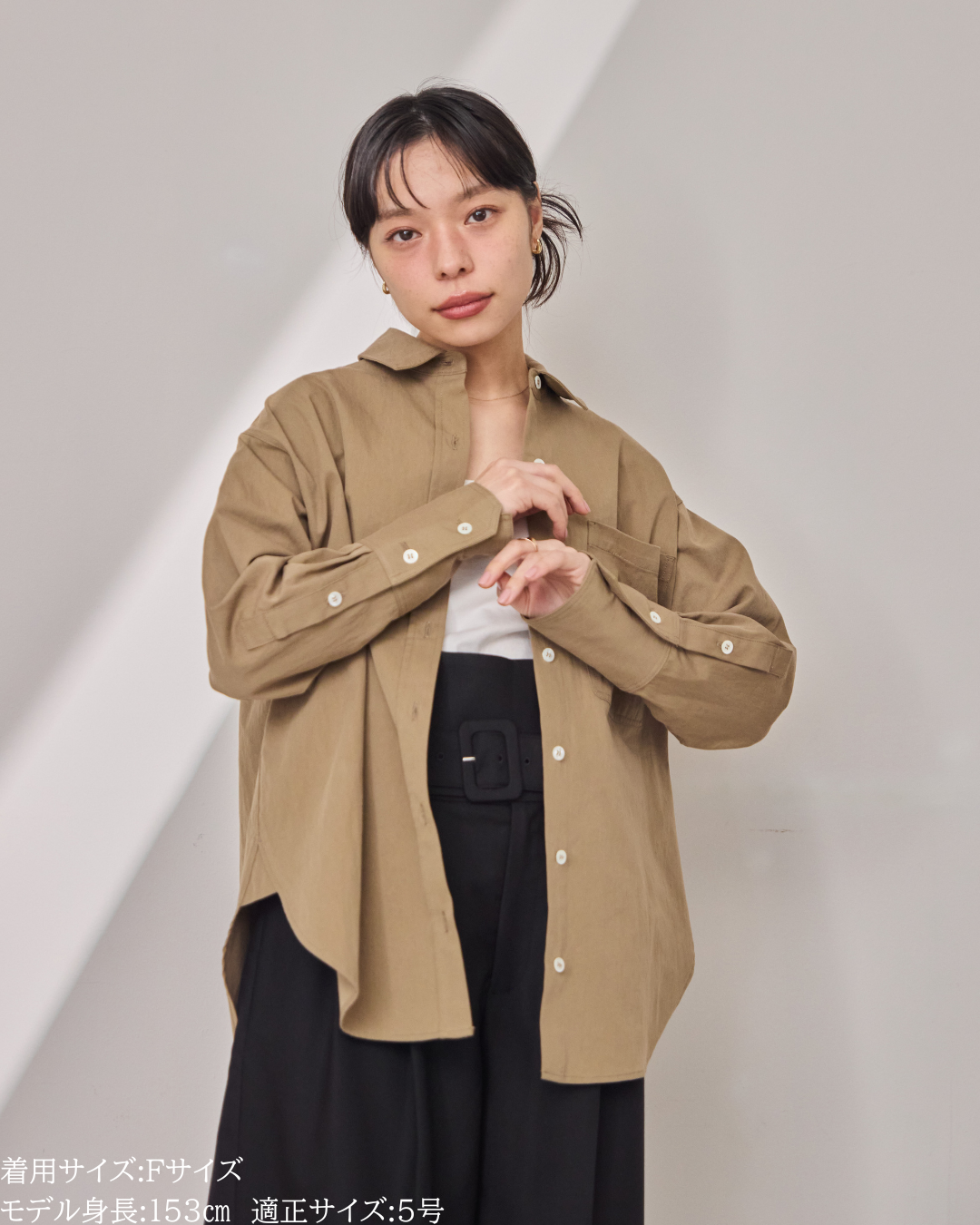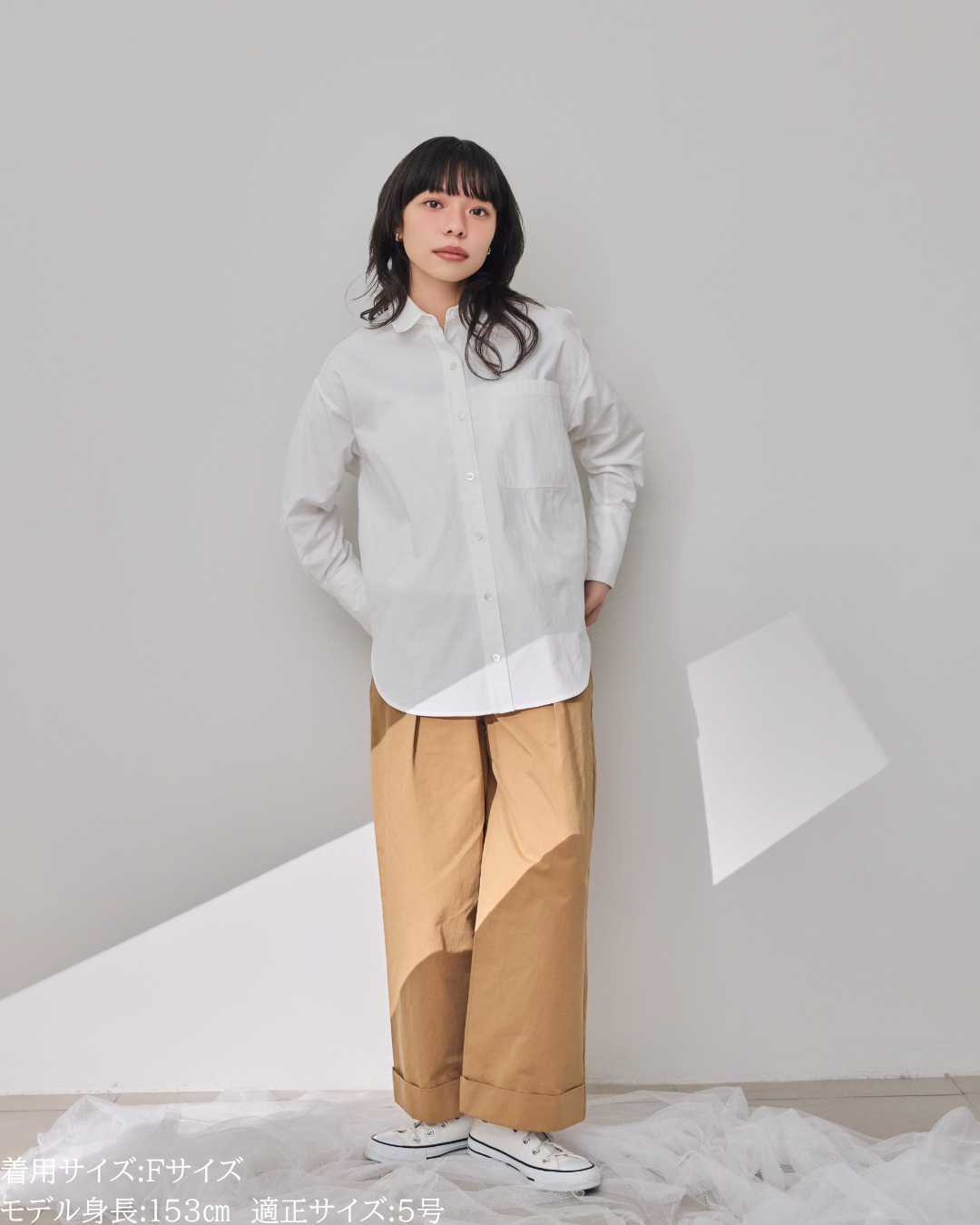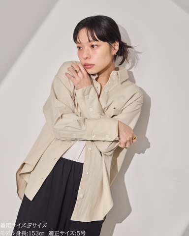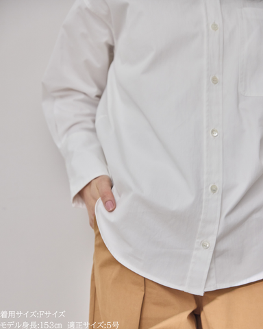 (F)着丈は足の付け根が隠れる長さで、袖丈は親指が少し見える長さです。袖を半分折り返すと手首が隠れる長さになりちょうどよく着られました。シンプルなシャツですがカフス部分が長めでデザイン性があります。張りのある生地感で体のラインを拾わないので着やすいです。 -