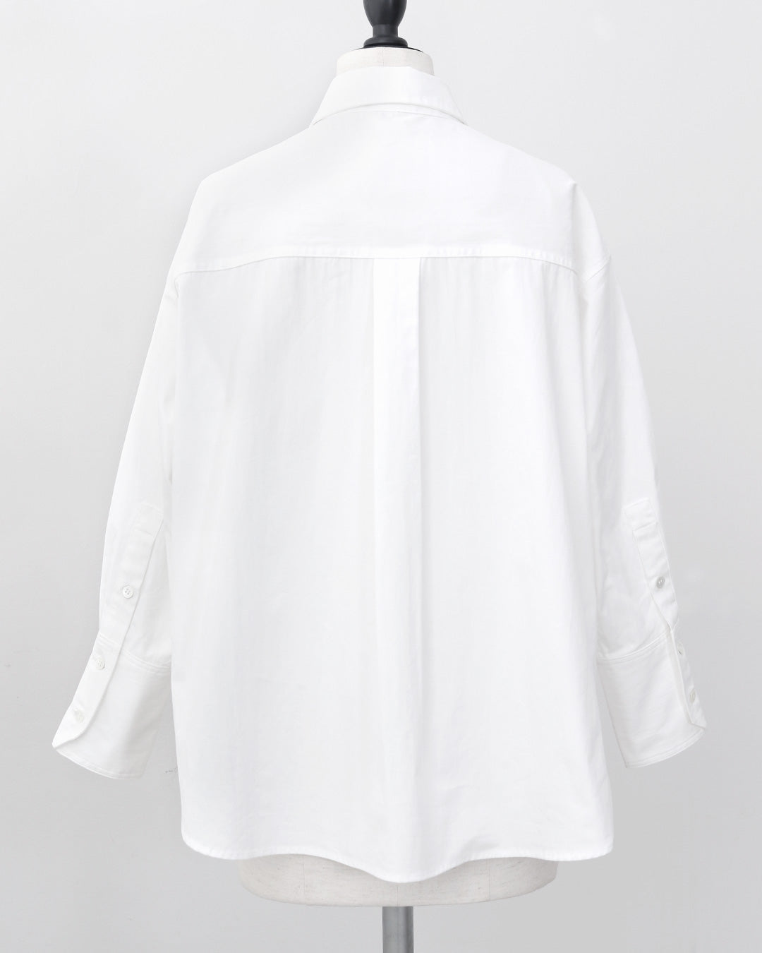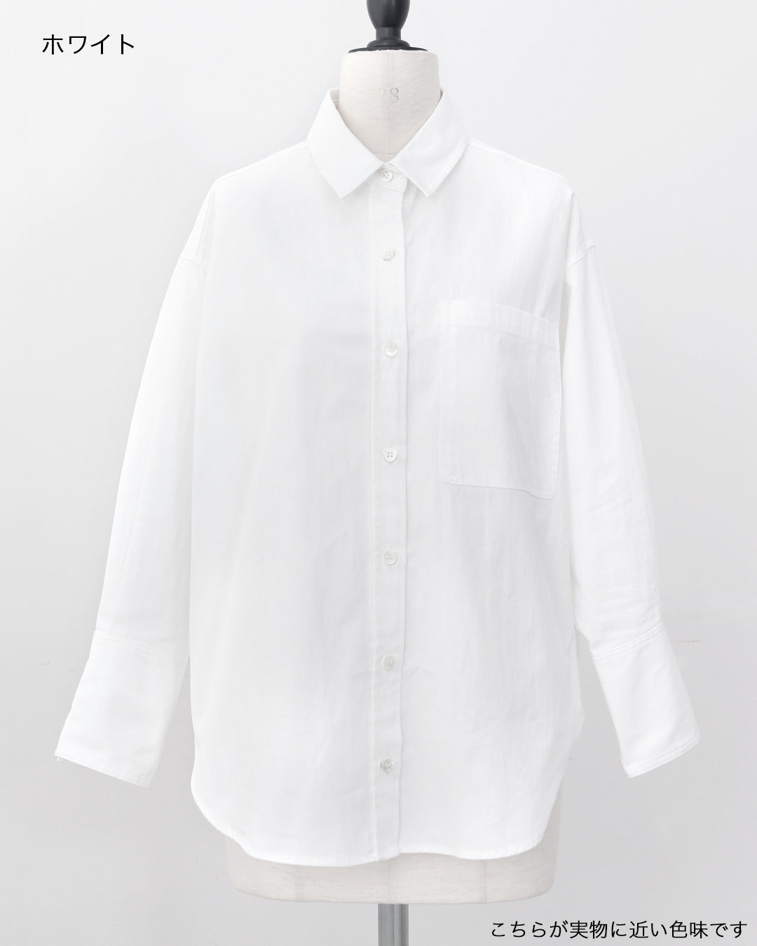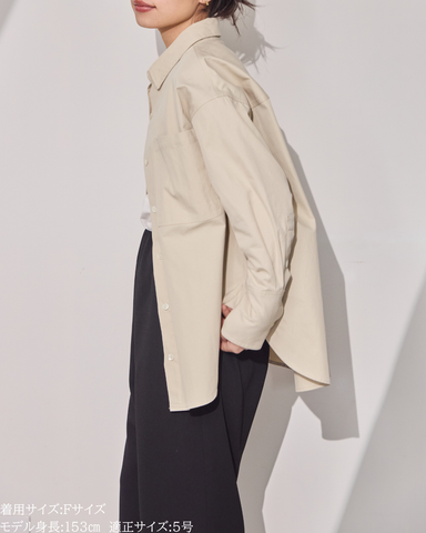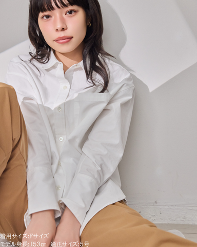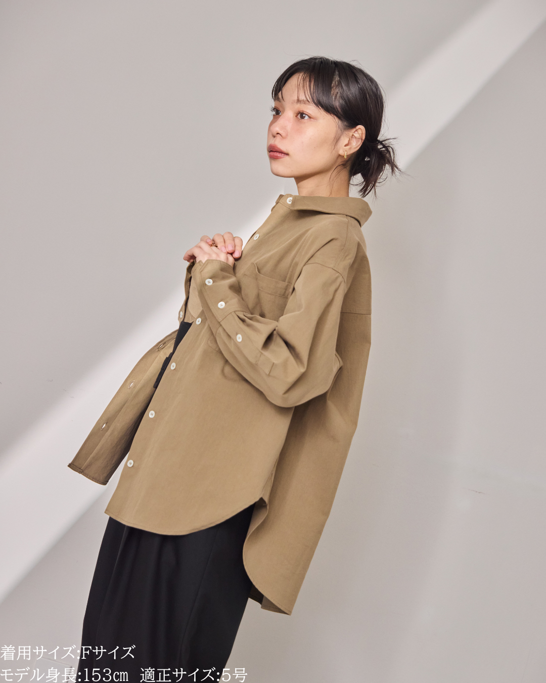 (F)着丈は足の付け根が隠れる長さで、袖丈は親指が少し見える長さです。袖を半分折り返すと手首が隠れる長さになりちょうどよく着られました。シンプルなシャツですがカフス部分が長めでデザイン性があります。張りのある生地感で体のラインを拾わないので着やすいです。 -