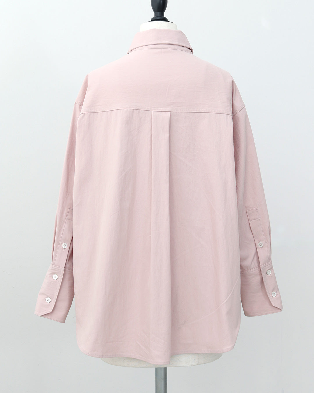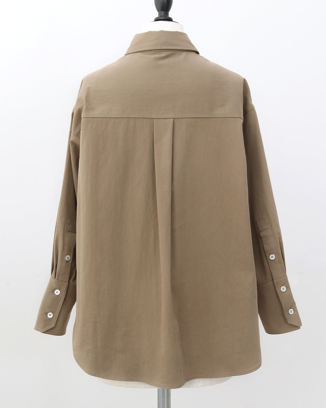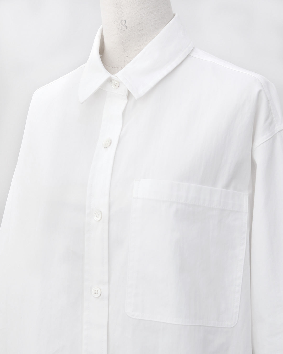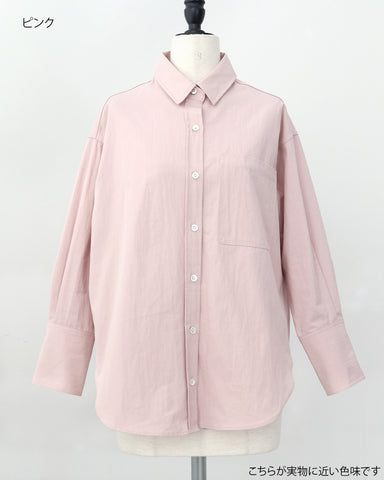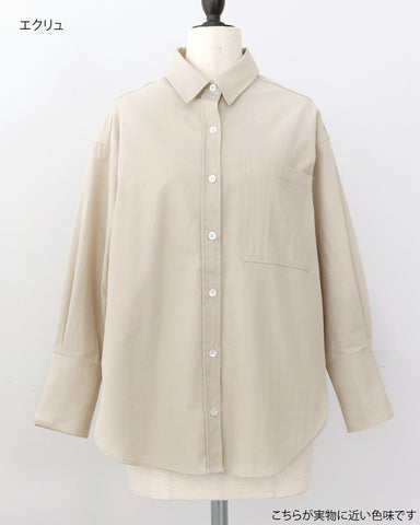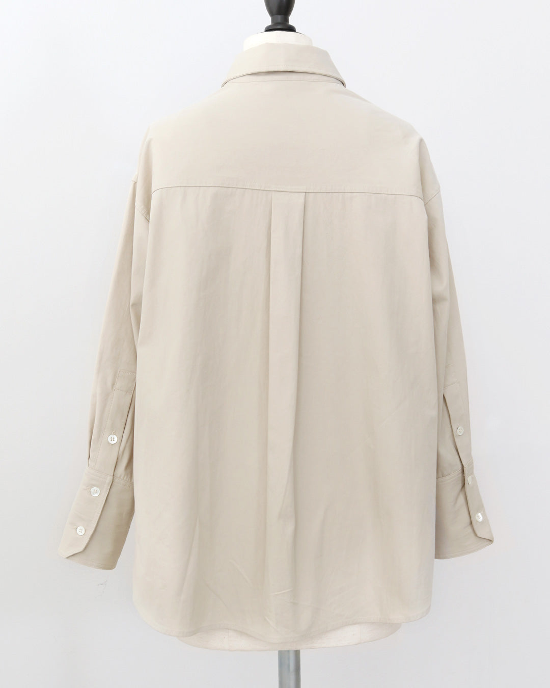 (F)着丈は足の付け根が隠れる長さで、袖丈は親指が少し見える長さです。袖を半分折り返すと手首が隠れる長さになりちょうどよく着られました。シンプルなシャツですがカフス部分が長めでデザイン性があります。張りのある生地感で体のラインを拾わないので着やすいです。 -