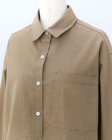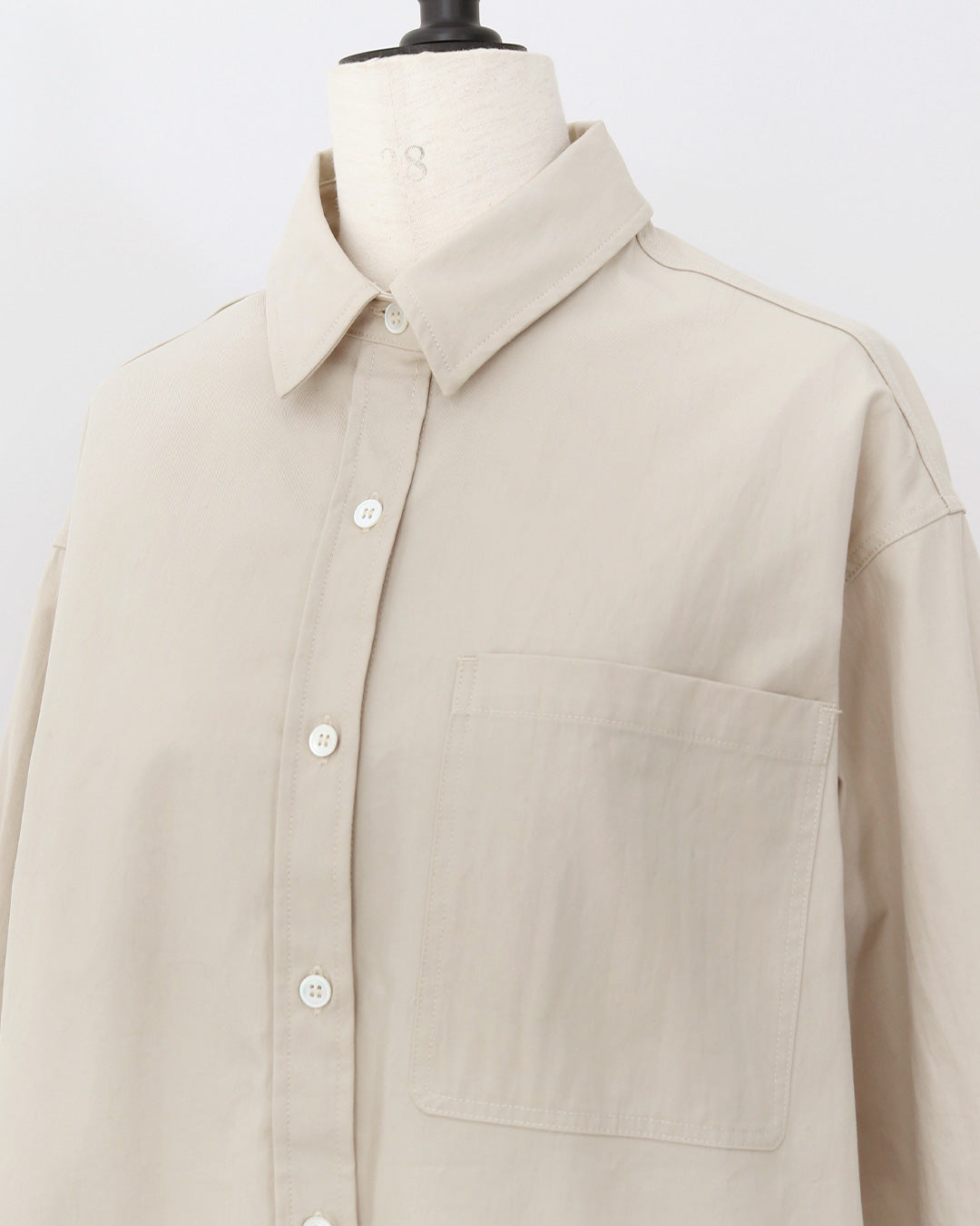 しっかり感がありながらも硬すぎず、身体に馴染む絶妙な厚みで、シャツとしても羽織としても活躍します。表情のある上品な風合いを生み、シンプルなデザインでも立体感のある仕上がりに。