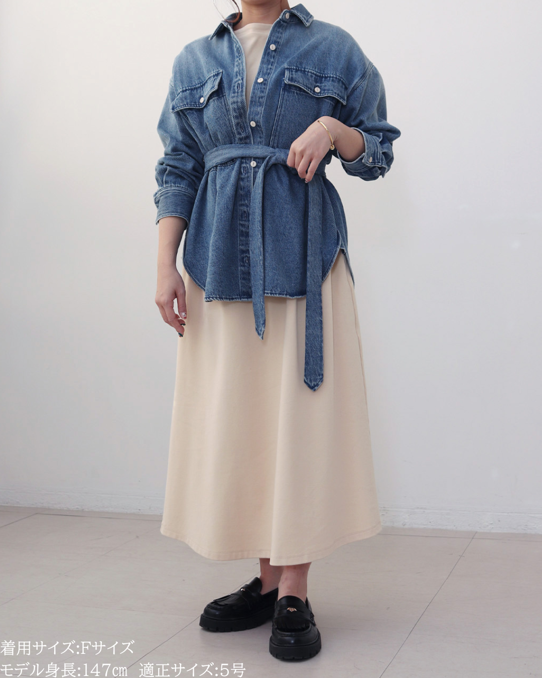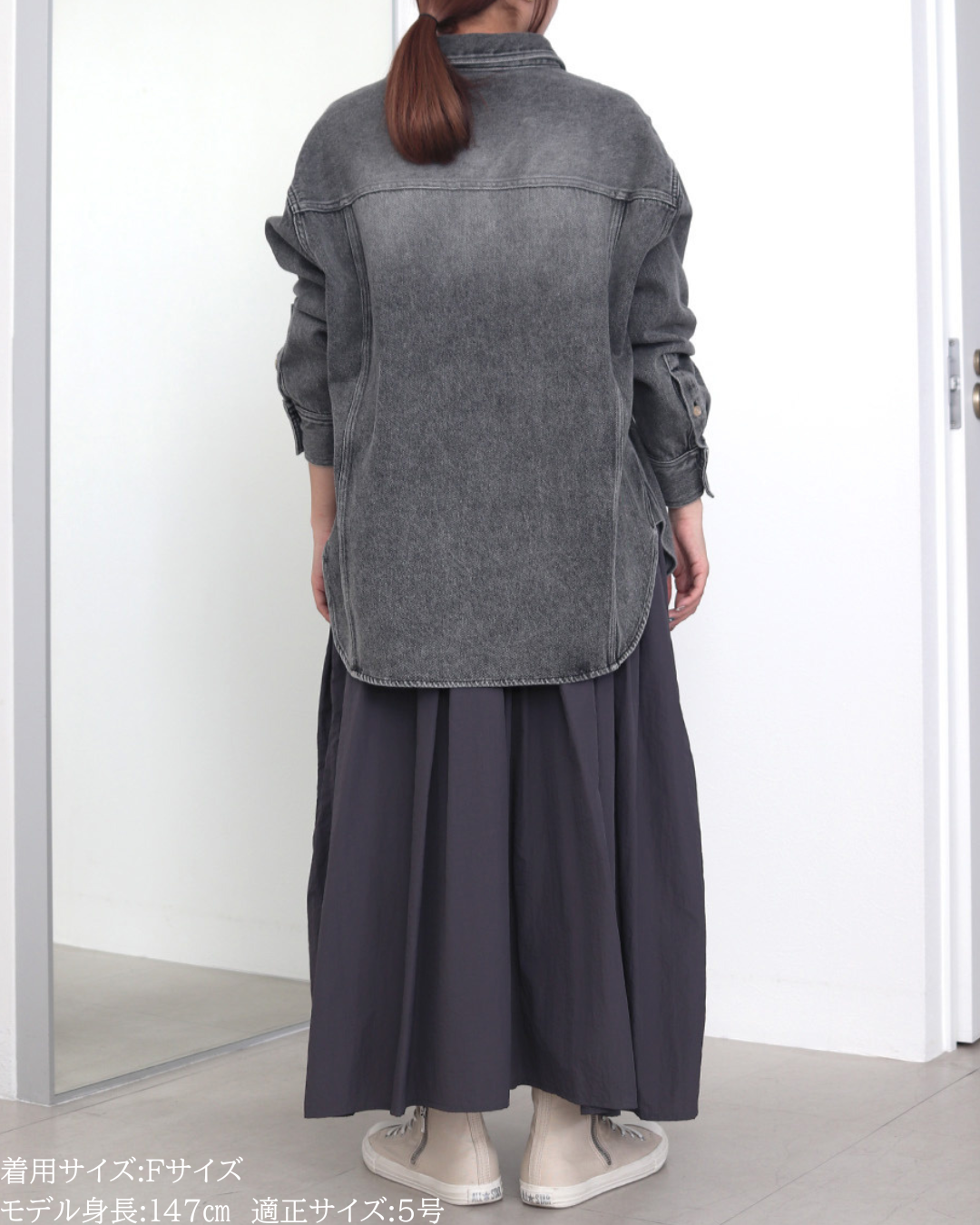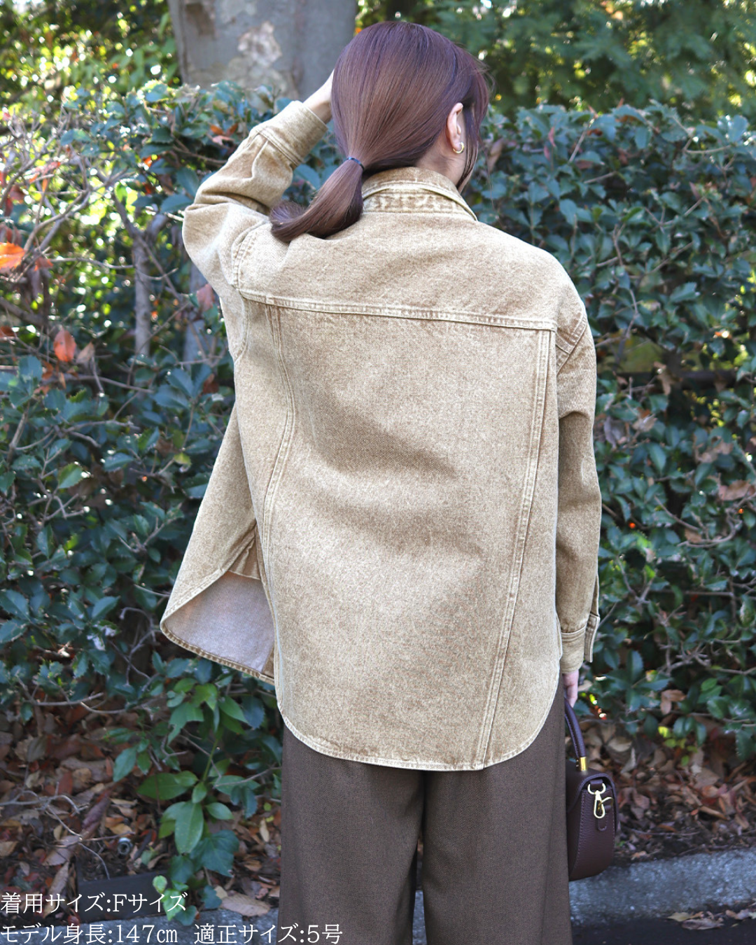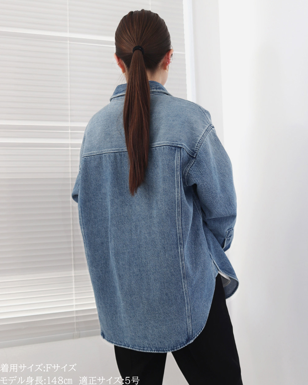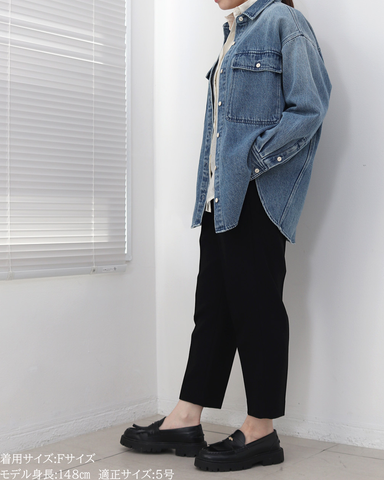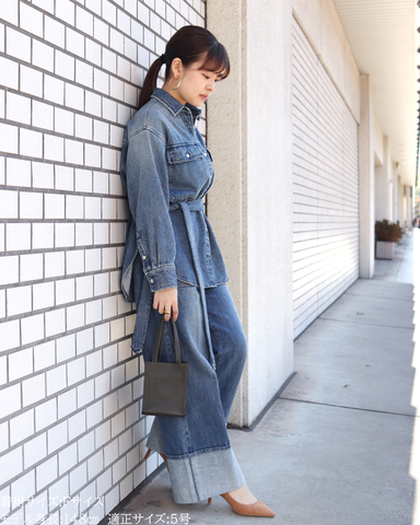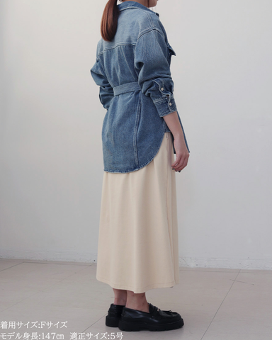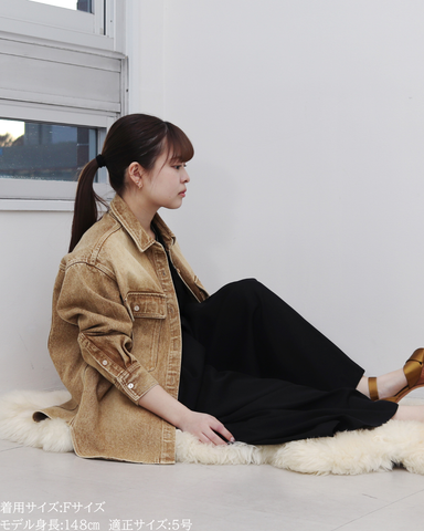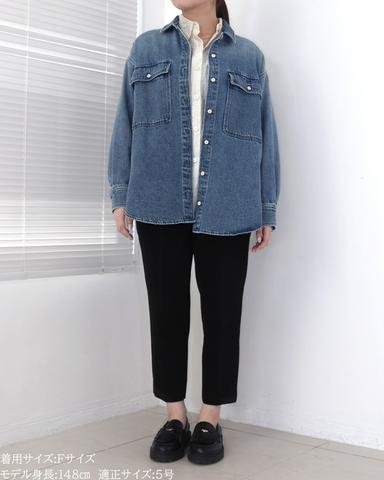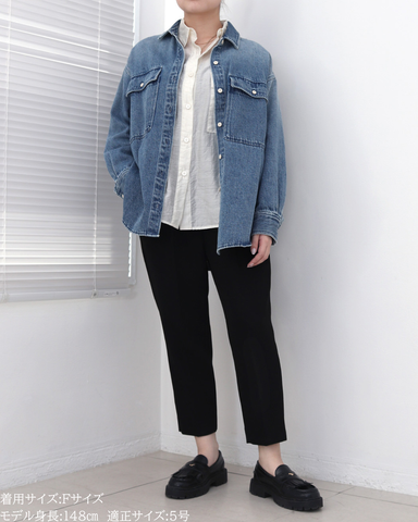 (F)袖丈は手首がしっかり隠れる長さ(私は身長に比べて腕が長いタイプです)となりました。着丈はヒップ下までとなり細めパンツと合わせた時の気になるヒップを隠してくれますし、ラウンドしているので前インした場合でもバランスよく着用できます。デニムですがゴワつきなく、肩周りも動きやすいです。