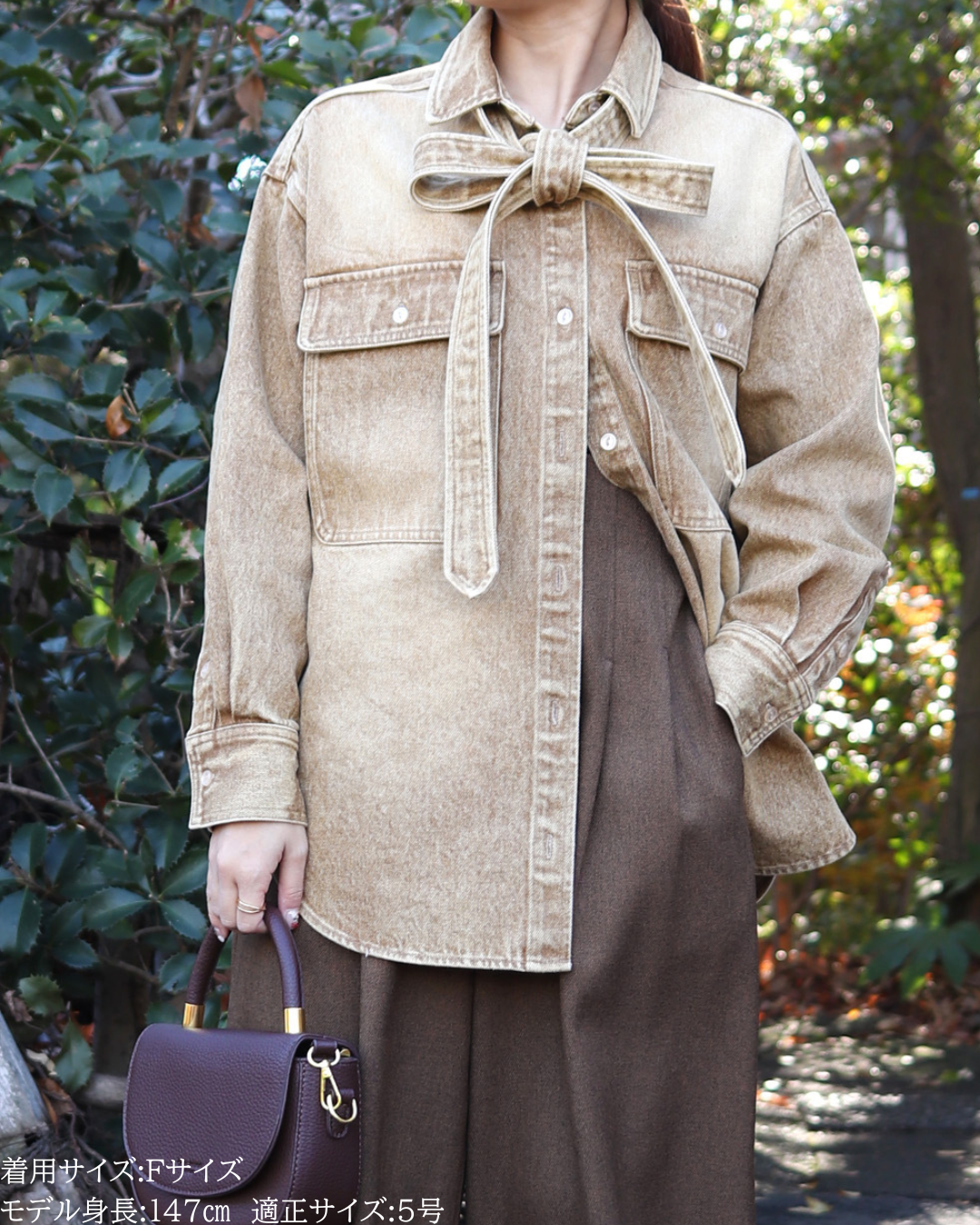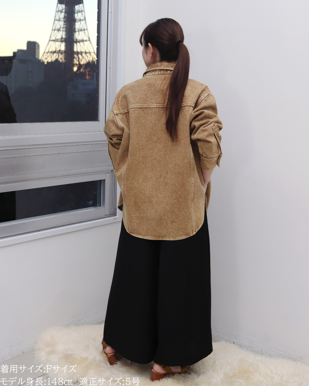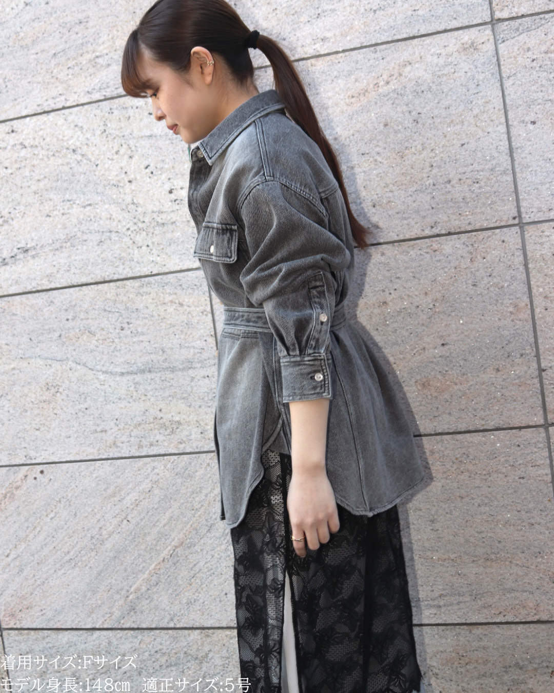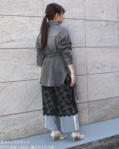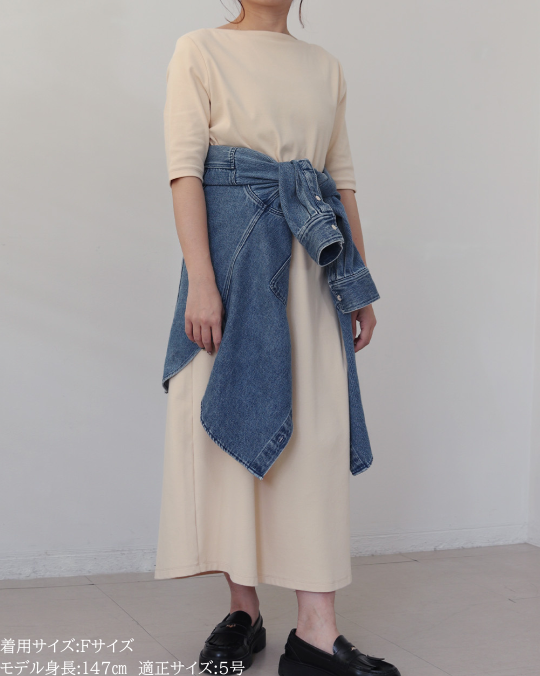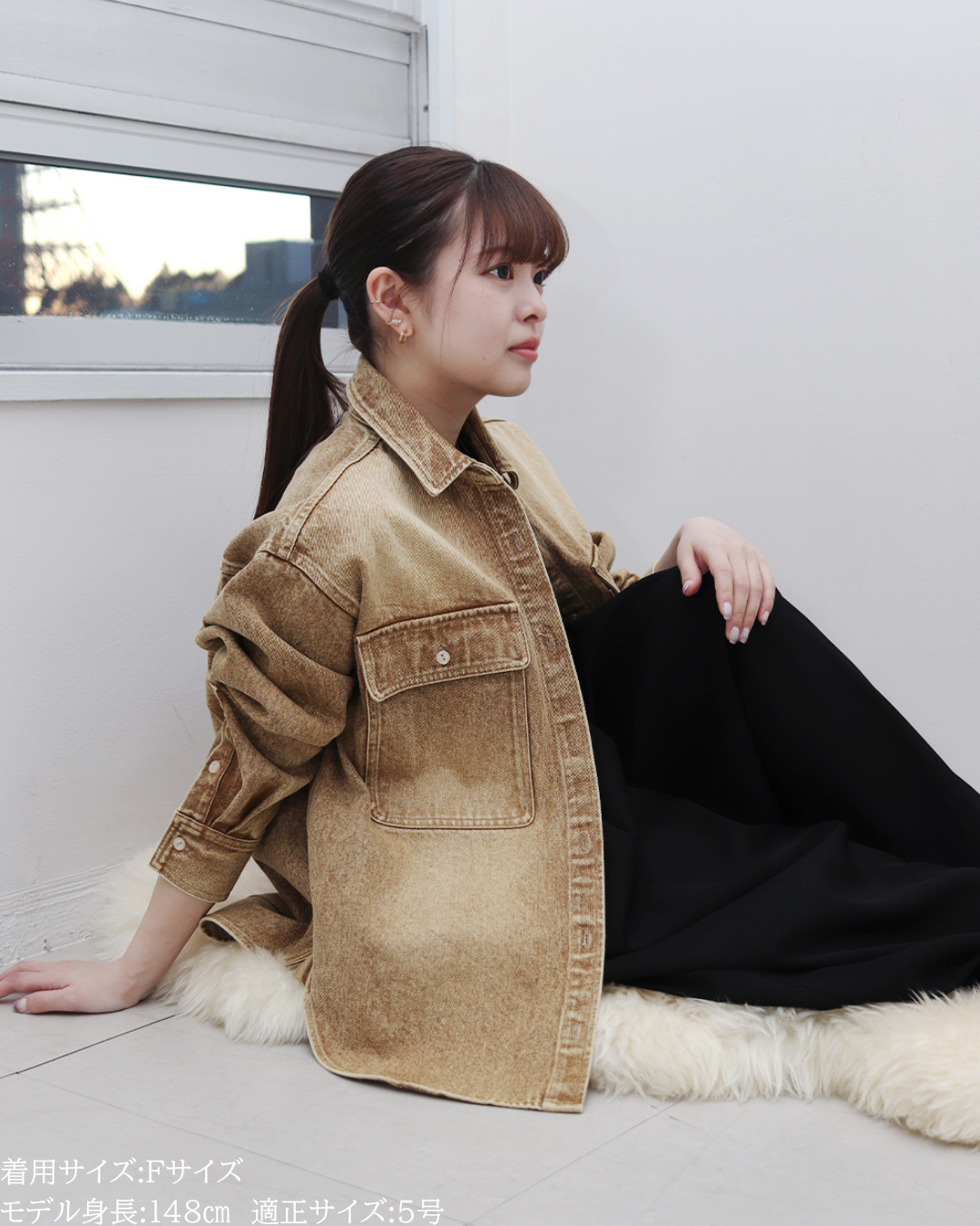 (F)袖丈は手首がしっかり隠れる長さ(私は身長に比べて腕が長いタイプです)となりました。着丈はヒップ下までとなり細めパンツと合わせた時の気になるヒップを隠してくれますし、ラウンドしているので前インした場合でもバランスよく着用できます。デニムですがゴワつきなく、肩周りも動きやすいです。