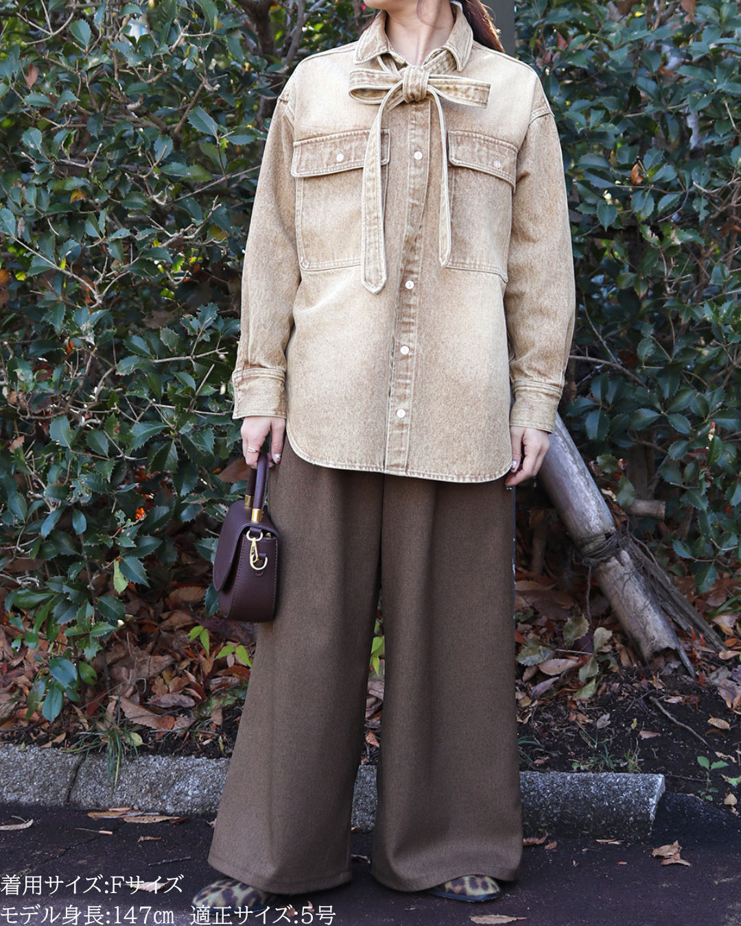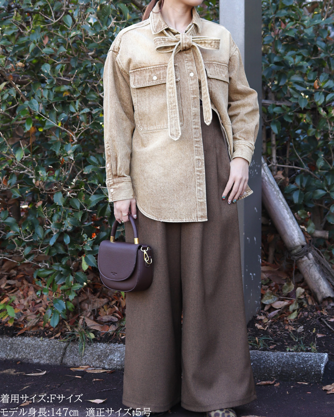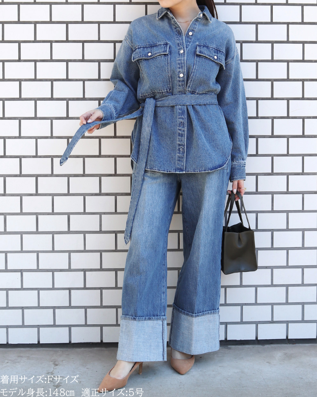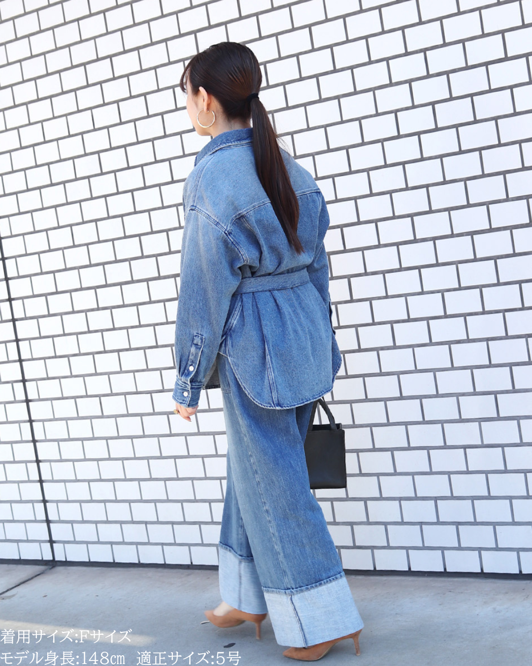 (F)袖丈は手首がしっかり隠れる長さ(私は身長に比べて腕が長いタイプです)となりました。着丈はヒップ下までとなり細めパンツと合わせた時の気になるヒップを隠してくれますし、ラウンドしているので前インした場合でもバランスよく着用できます。デニムですがゴワつきなく、肩周りも動きやすいです。