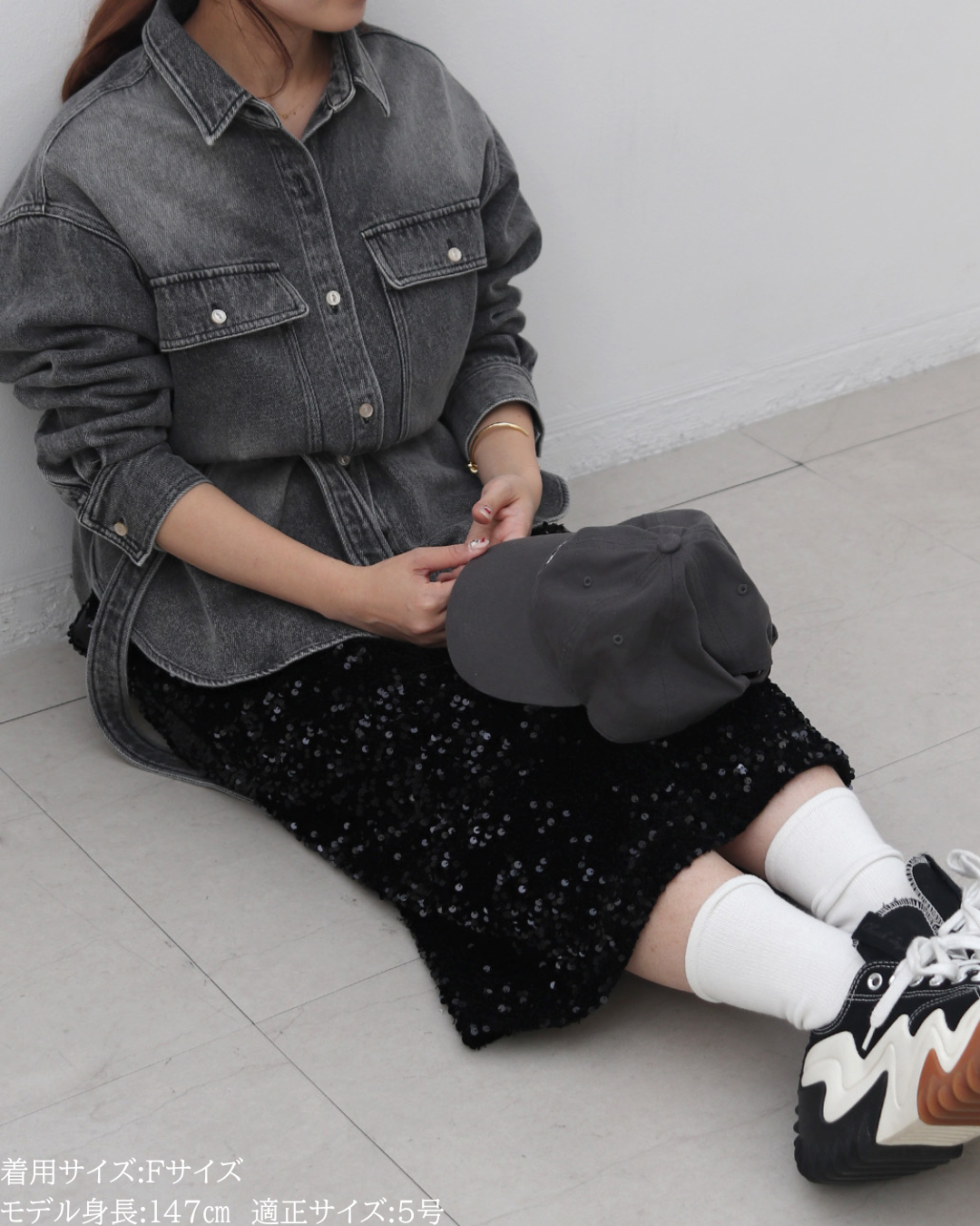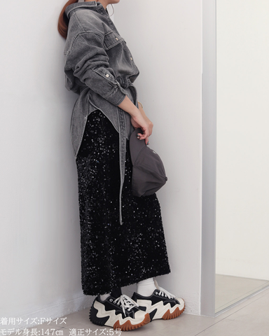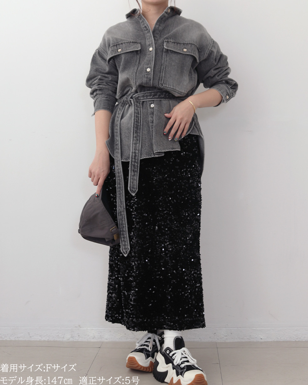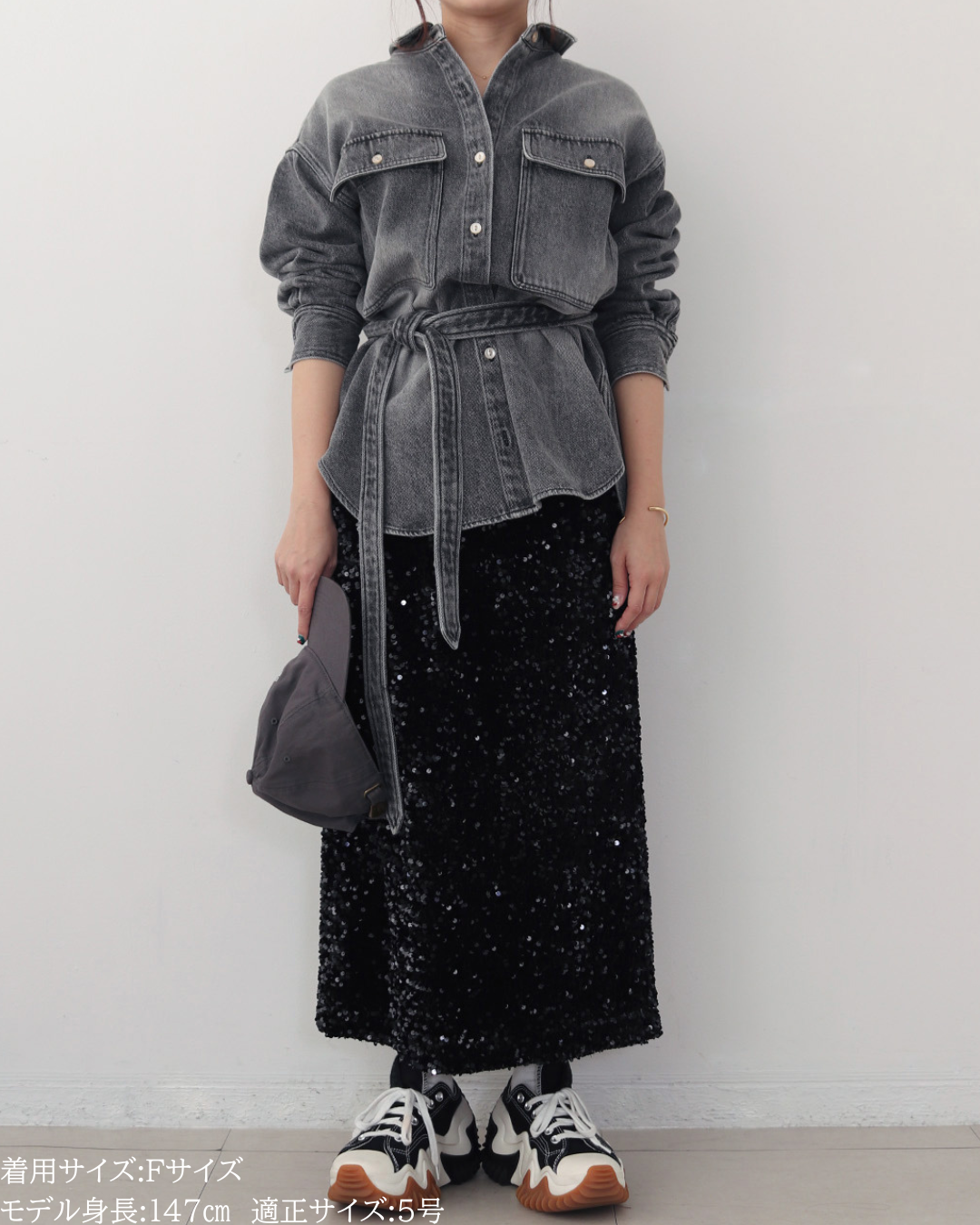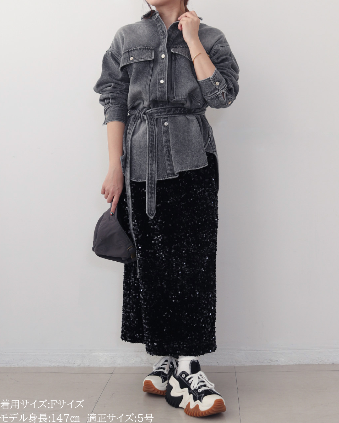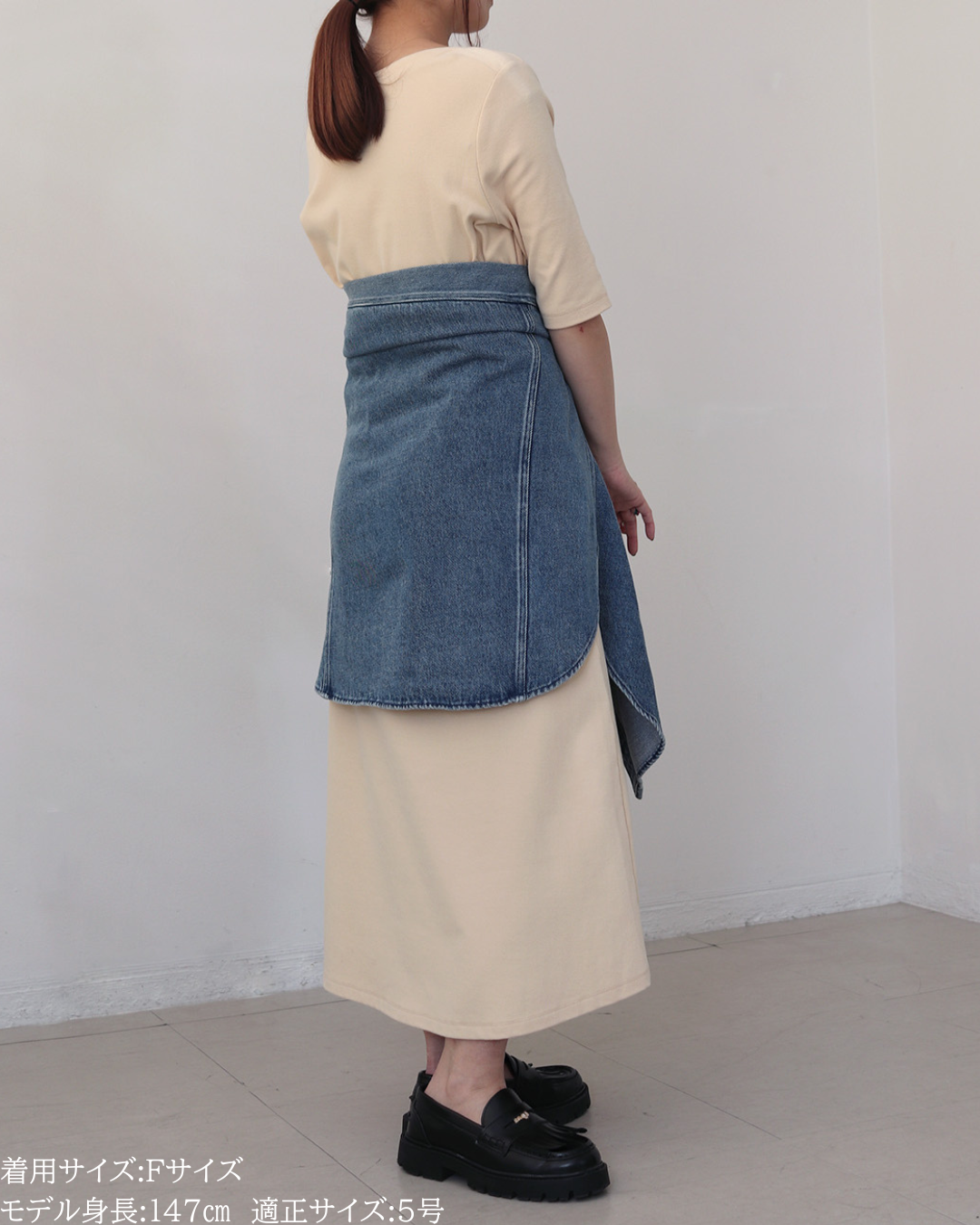 (F)袖丈は手首がしっかり隠れる長さ(私は身長に比べて腕が長いタイプです)となりました。着丈はヒップ下までとなり細めパンツと合わせた時の気になるヒップを隠してくれますし、ラウンドしているので前インした場合でもバランスよく着用できます。デニムですがゴワつきなく、肩周りも動きやすいです。