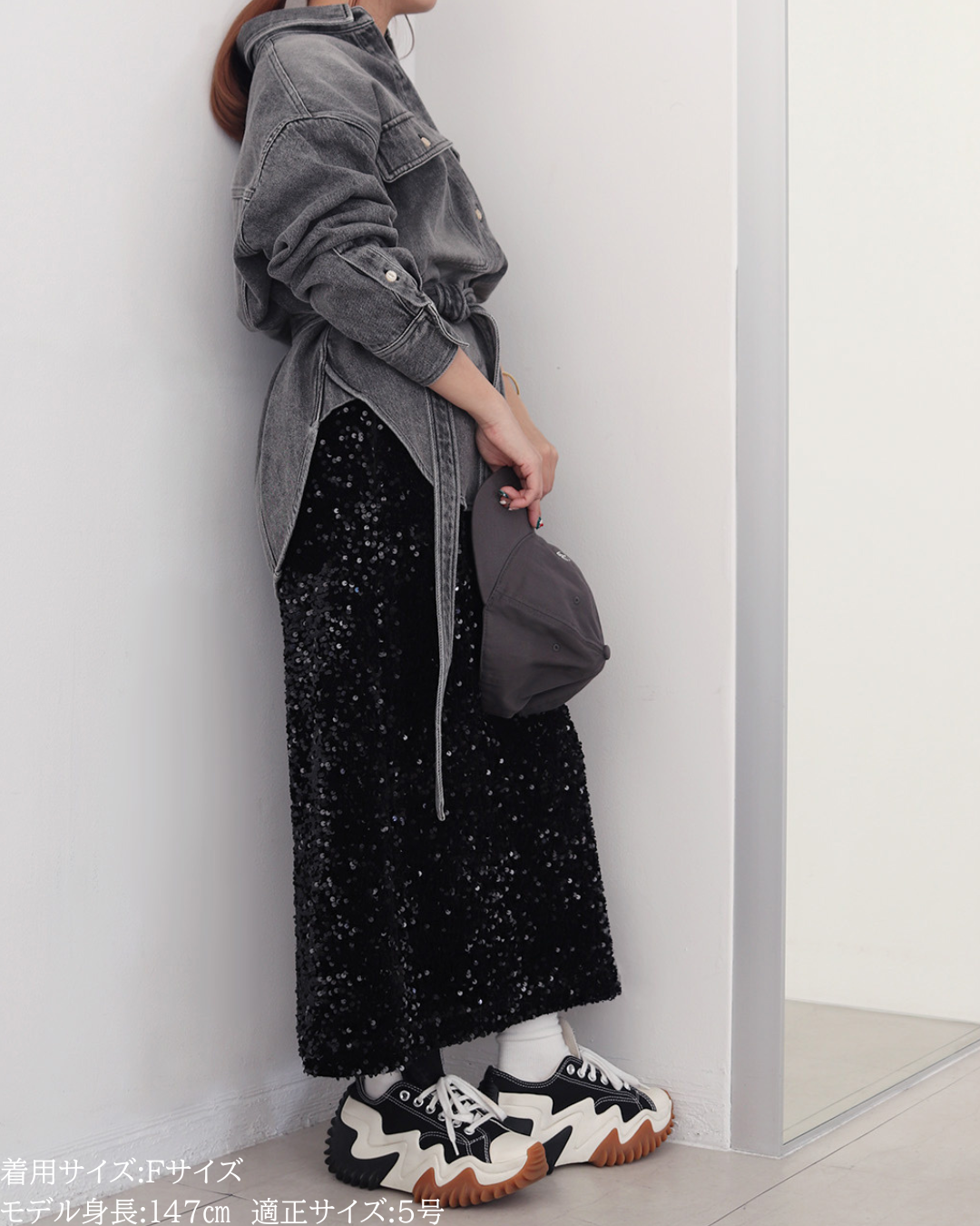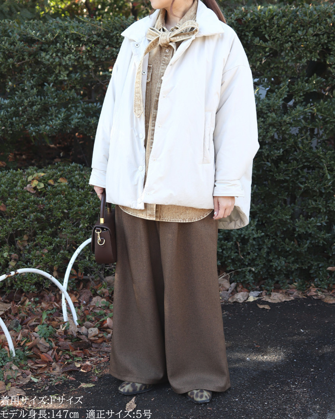 (F)袖丈は親指が少し見えるぐらいになりますが、袖をまくったり、手首で弛ませてアレンジできます。着丈はヒップが隠れる長さで体型カバーしてくれます。秋の羽織としても使えそうです。