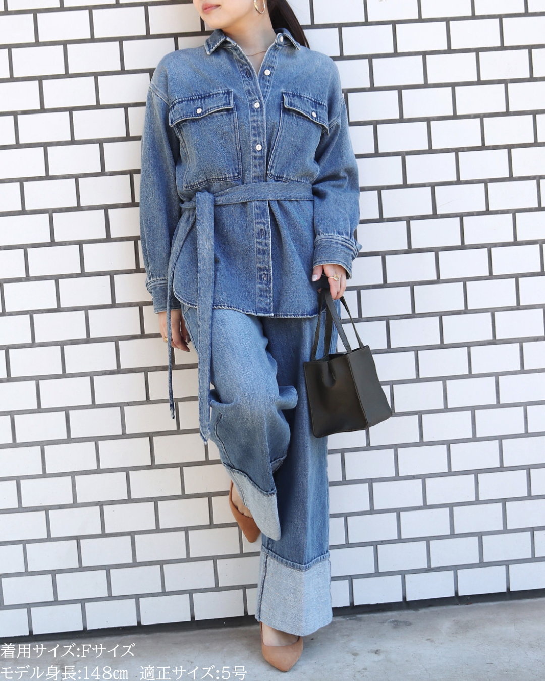 白Tをインして羽織りに。ボトムスを同じデニム素材で合わせても今年らしいスタイルの完成です。