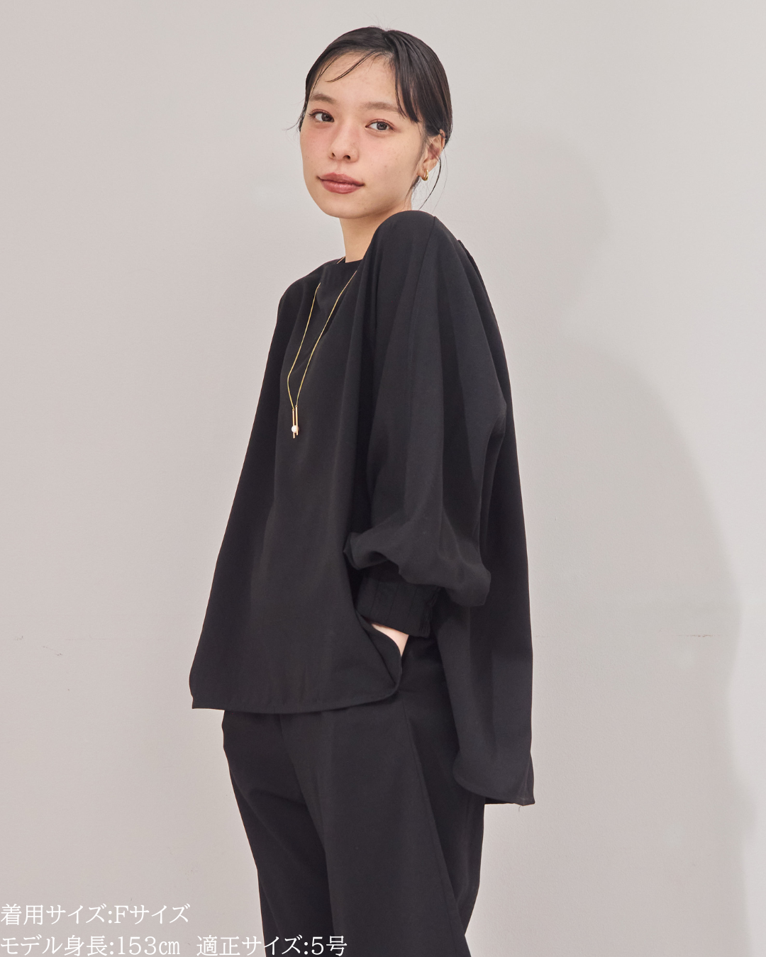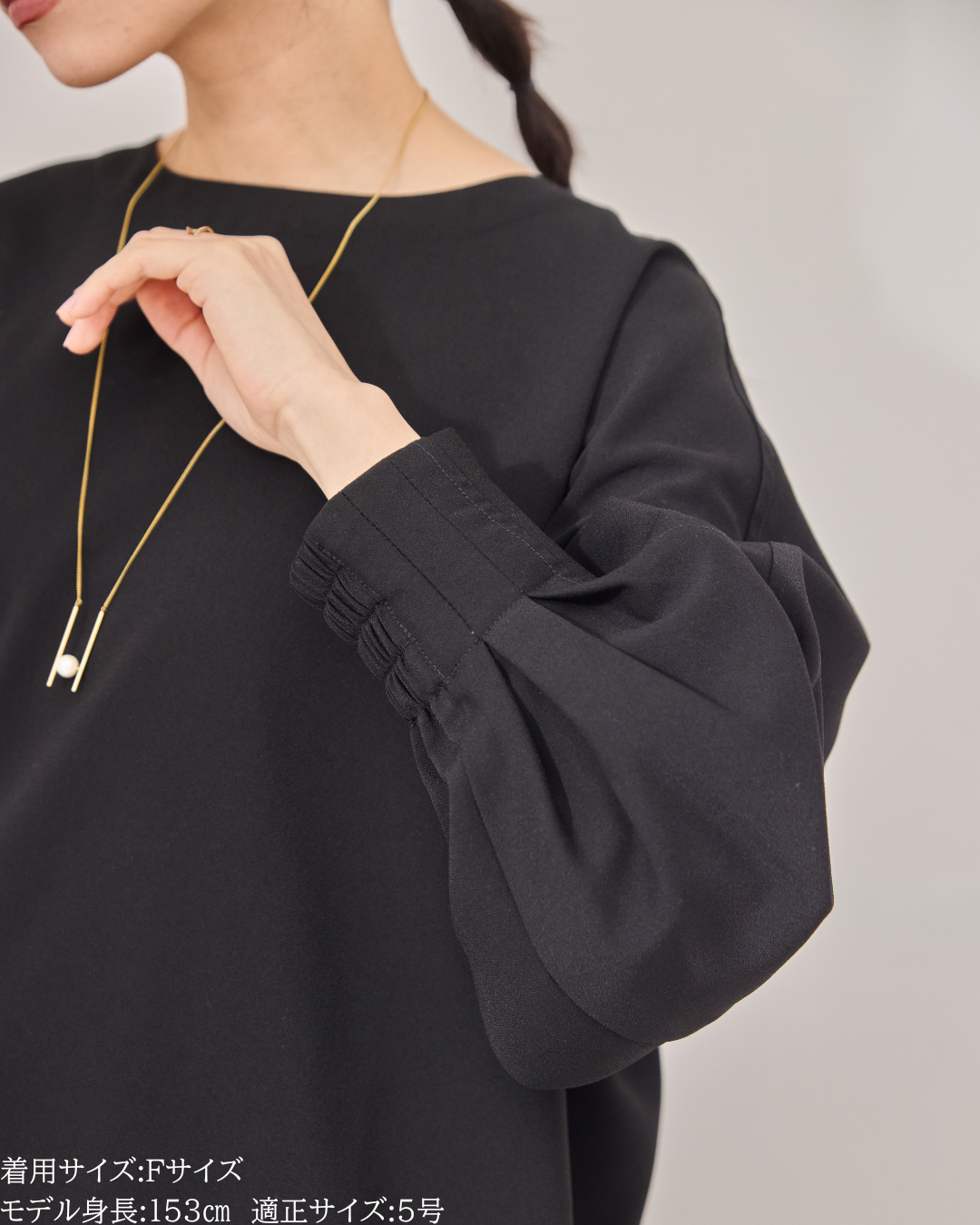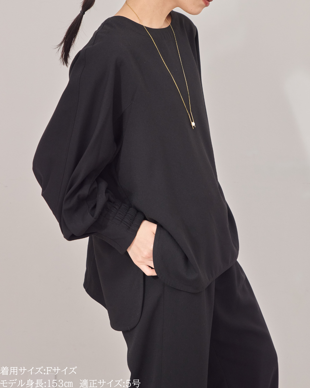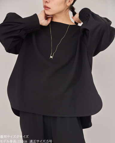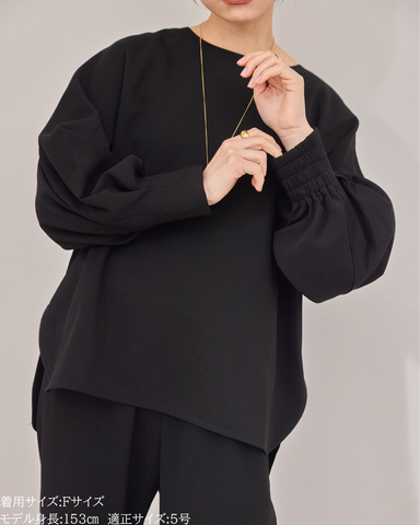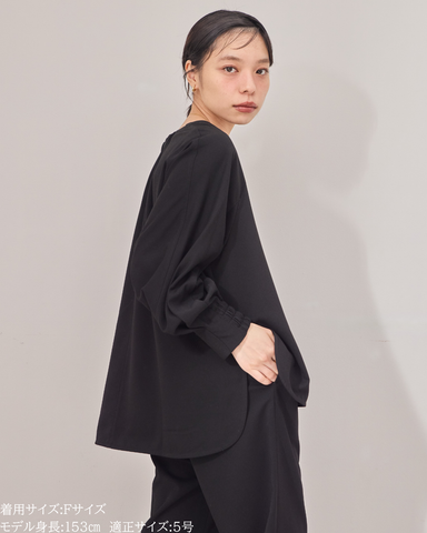 (F)袖丈は親指の付け根にかかるくらいの長さ(私は身長に比べて腕が長いタイプです)になりました。袖口の内側がゴムになっておりますので袖を少し上げて手首をスッキリみせて袖を弛ませて着るのが素敵です。着丈はヒップがしっかりと隠れる長さとなりましたが、生地がサラッとしておりますので落ち感と軽さがあり重たい印象になりません。首周りはスッキリとしており鎖骨のラインがチラッと見え女性らしいシルエットになります。