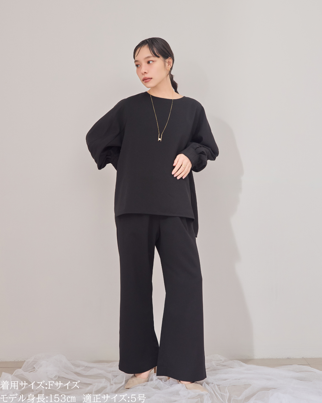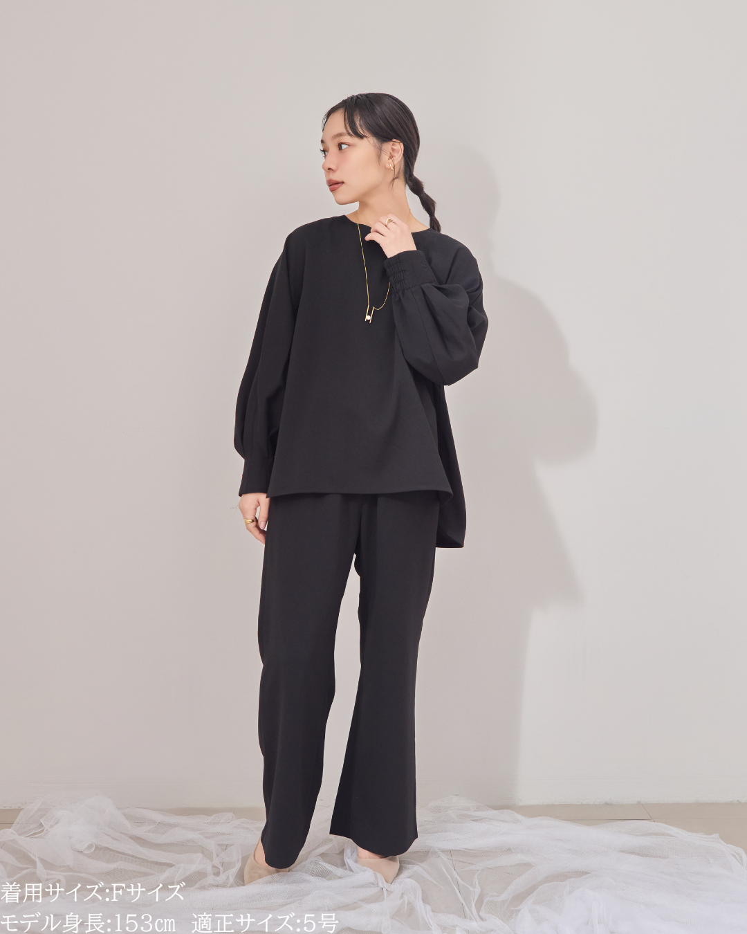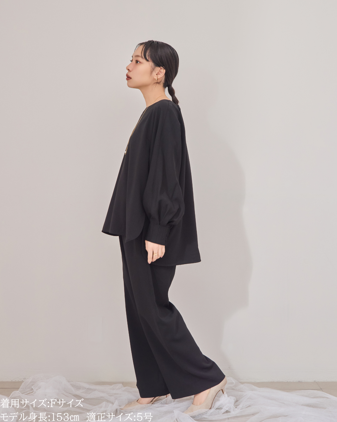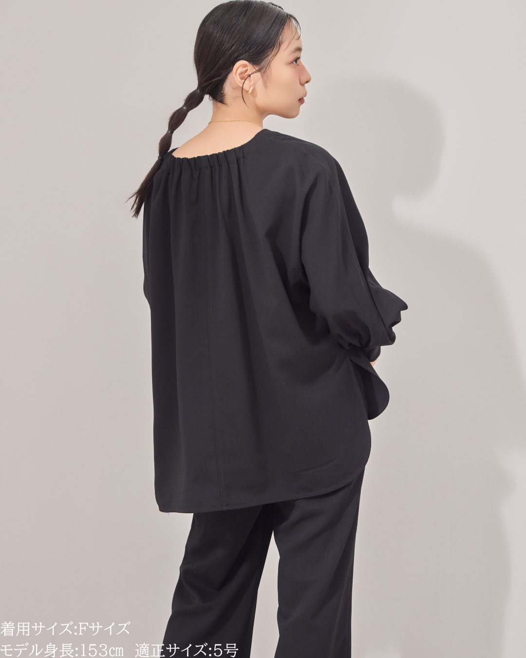 (F)袖丈は親指の付け根にかかるくらいの長さ(私は身長に比べて腕が長いタイプです)になりました。袖口の内側がゴムになっておりますので袖を少し上げて手首をスッキリみせて袖を弛ませて着るのが素敵です。着丈はヒップがしっかりと隠れる長さとなりましたが、生地がサラッとしておりますので落ち感と軽さがあり重たい印象になりません。首周りはスッキリとしており鎖骨のラインがチラッと見え女性らしいシルエットになります。