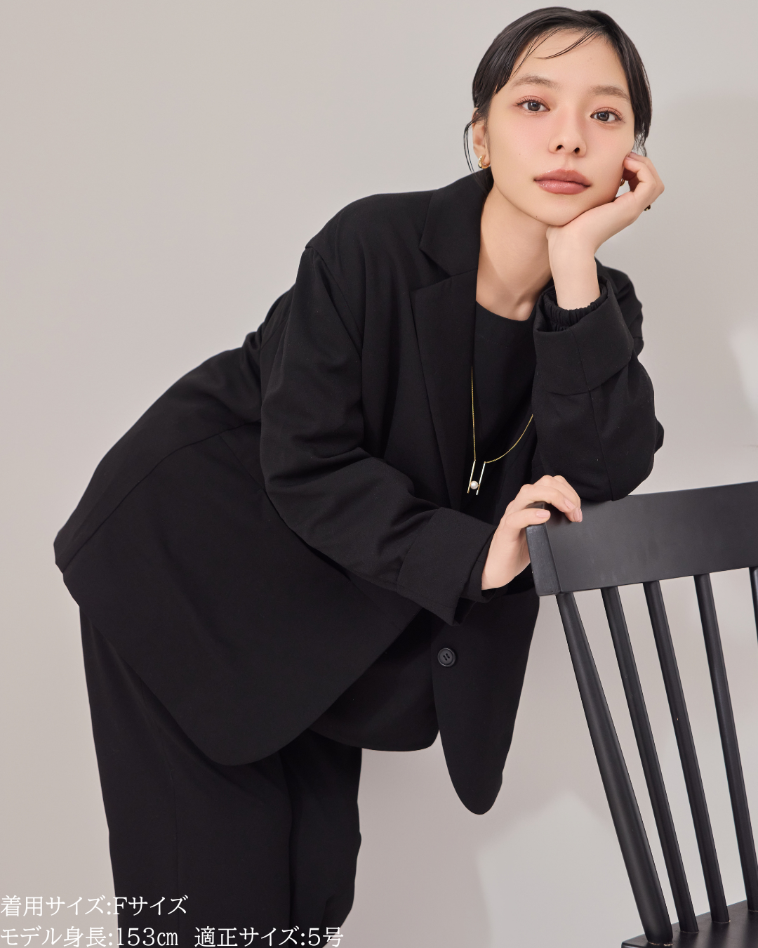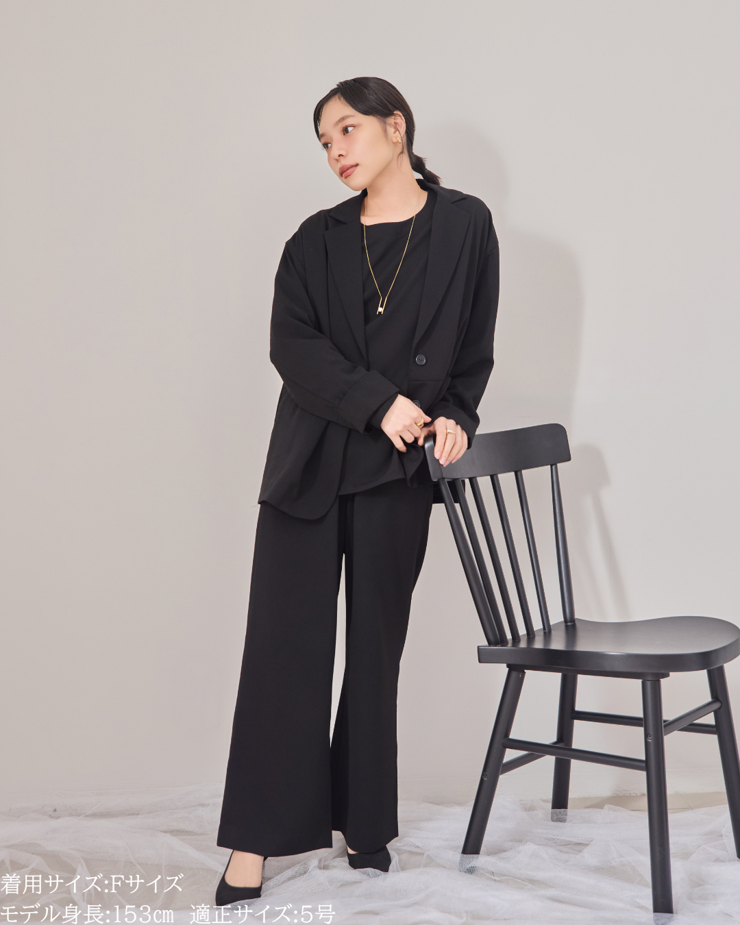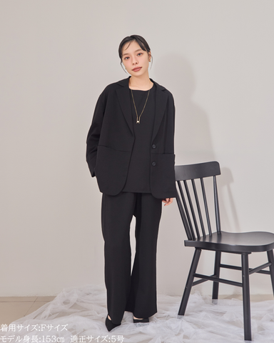 ① オケージョン同素材のジョーゼットジャケット(セットアップ可能)・ジョーゼットパンツ(セットアップ可能)とセットアップで。一枚でもきちんと見えするので、ジャケットなしでも対応可能。