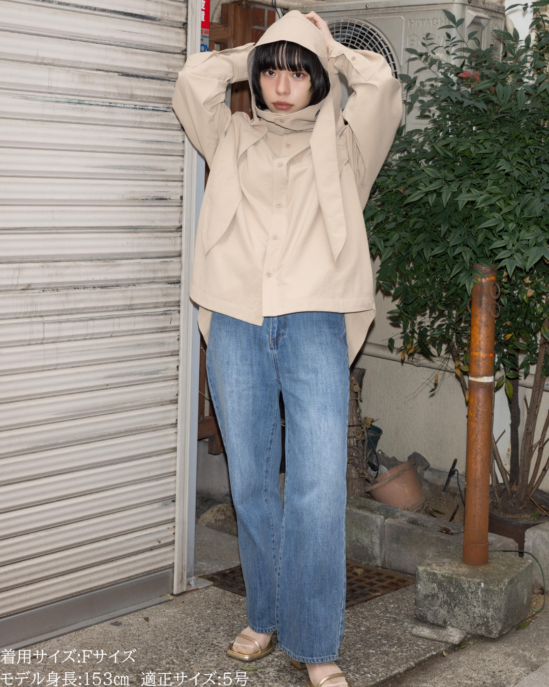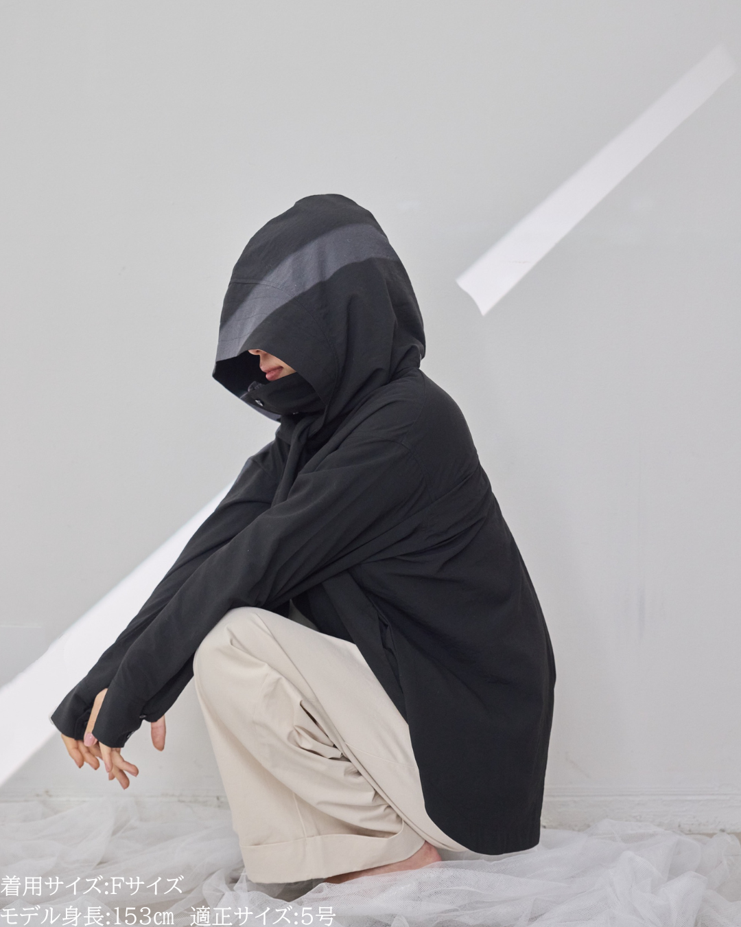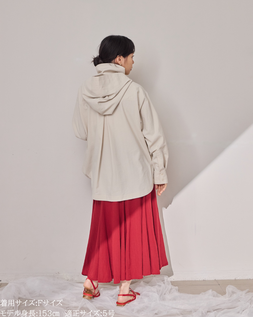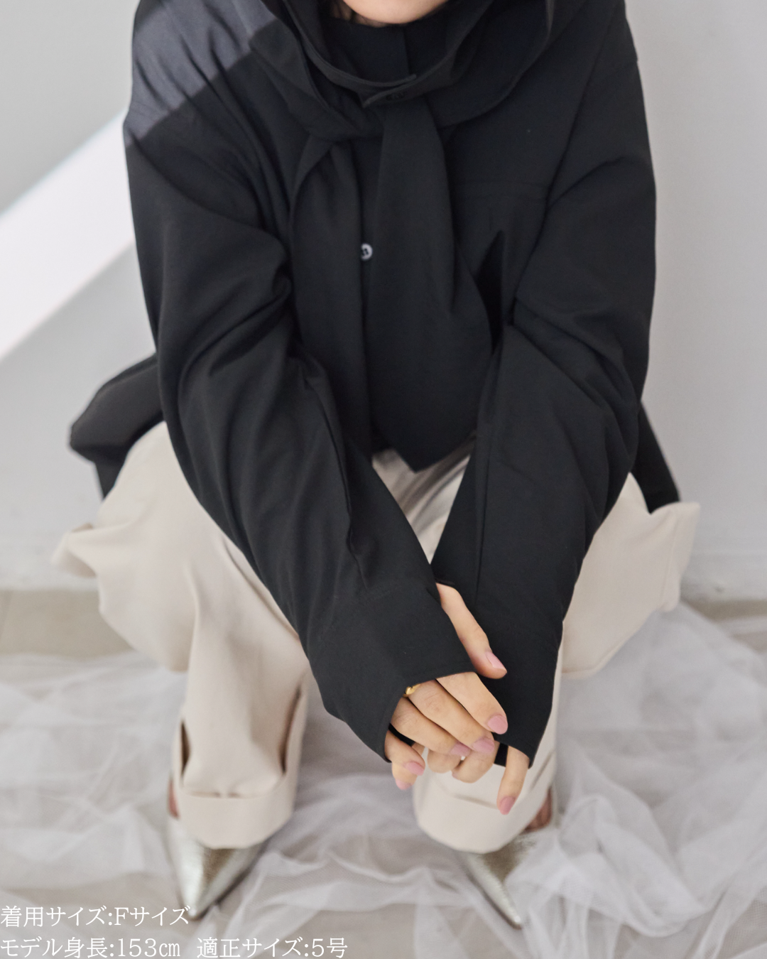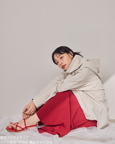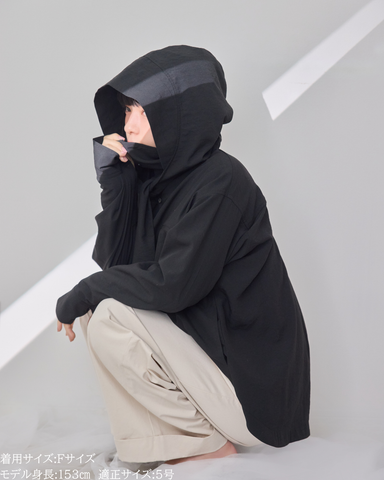 (F)袖丈はしっかり伸ばすと指の付け根くらいの長さになりました。(私は身長に比べて腕が長いタイプです)カフス部分がしっかりと長さがあるので袖丈が長い方は折り返してもデザイン損なうことなく着用できますがゆったり長めに着用するのもリラックス感があって素敵です。着丈は前後差がありヒップがしっかり隠れる長さが安心感があり良いです。UV対策ができるトップスはカジュアルになりがちで素材によってはスポーティー感が出やすいものが多い中、こちらは綺麗めコーデにも使えて、フードの着脱やボタンの開閉によりUV対策もできまたオシャレなビックカラーにもなったりとすごく重宝する1枚です。