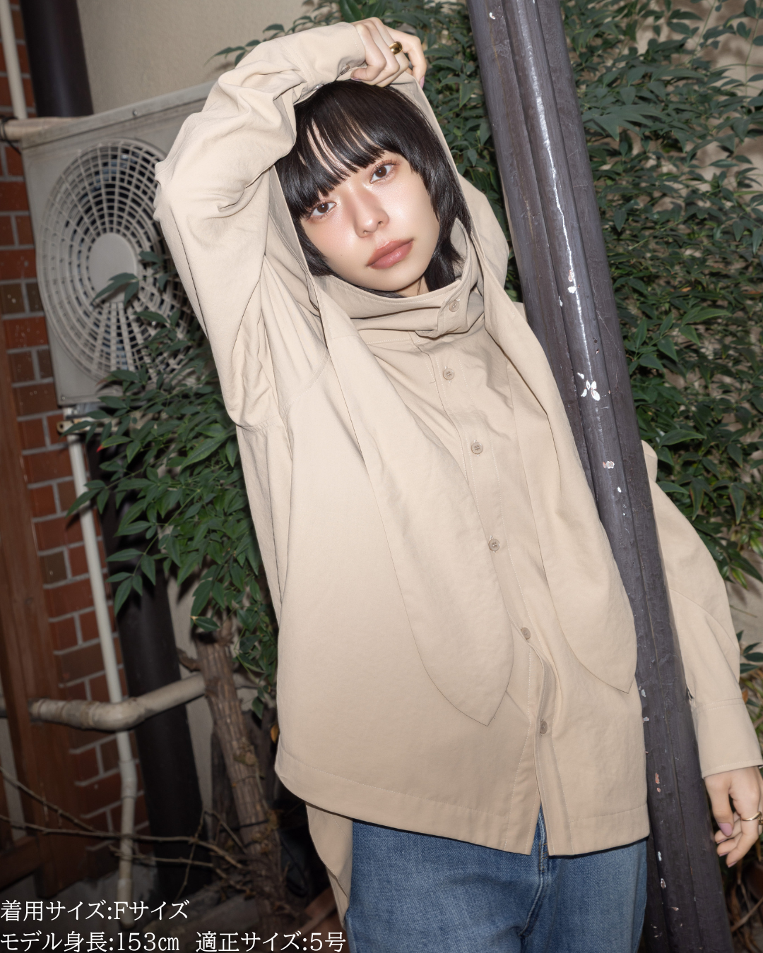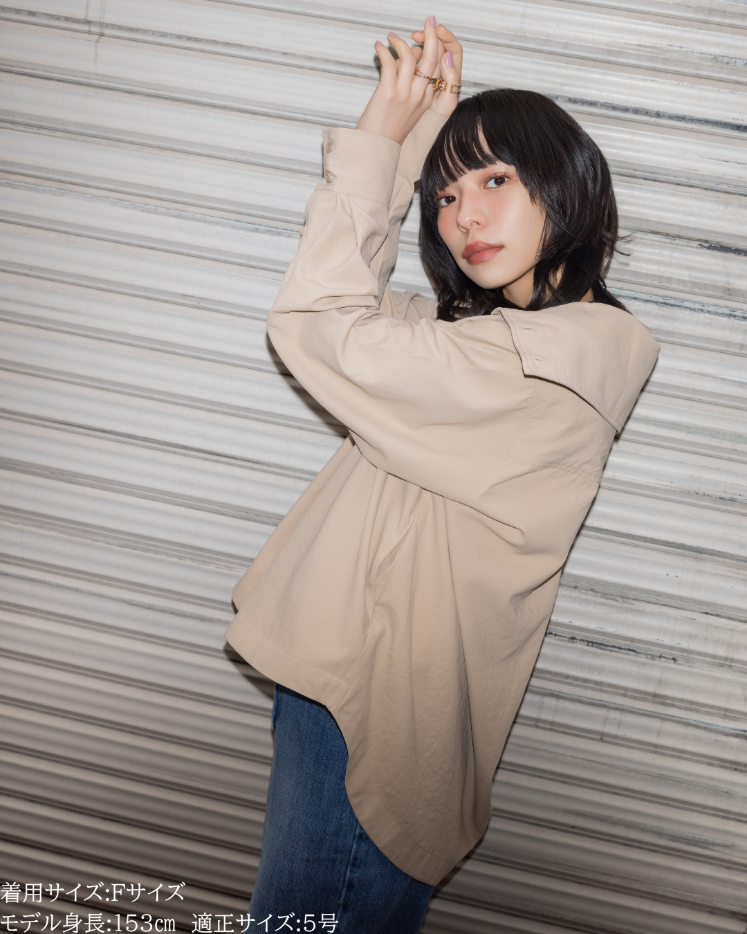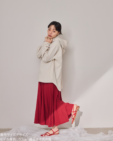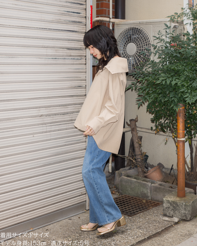 (F)袖丈は親指が隠れる長さで、着丈はヒップが隠れる長さで安心感があります。身幅もゆとりがあり、中にも着こめそうです。カジュアル感は控えめでシャツのようなきれいめな印象で着られました。生地も柔らかく動きやすいです。 -