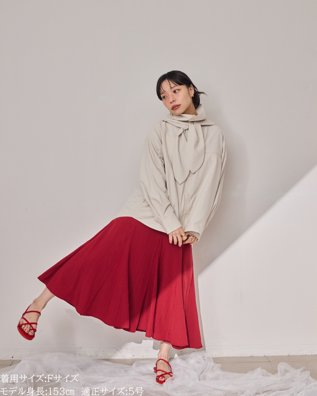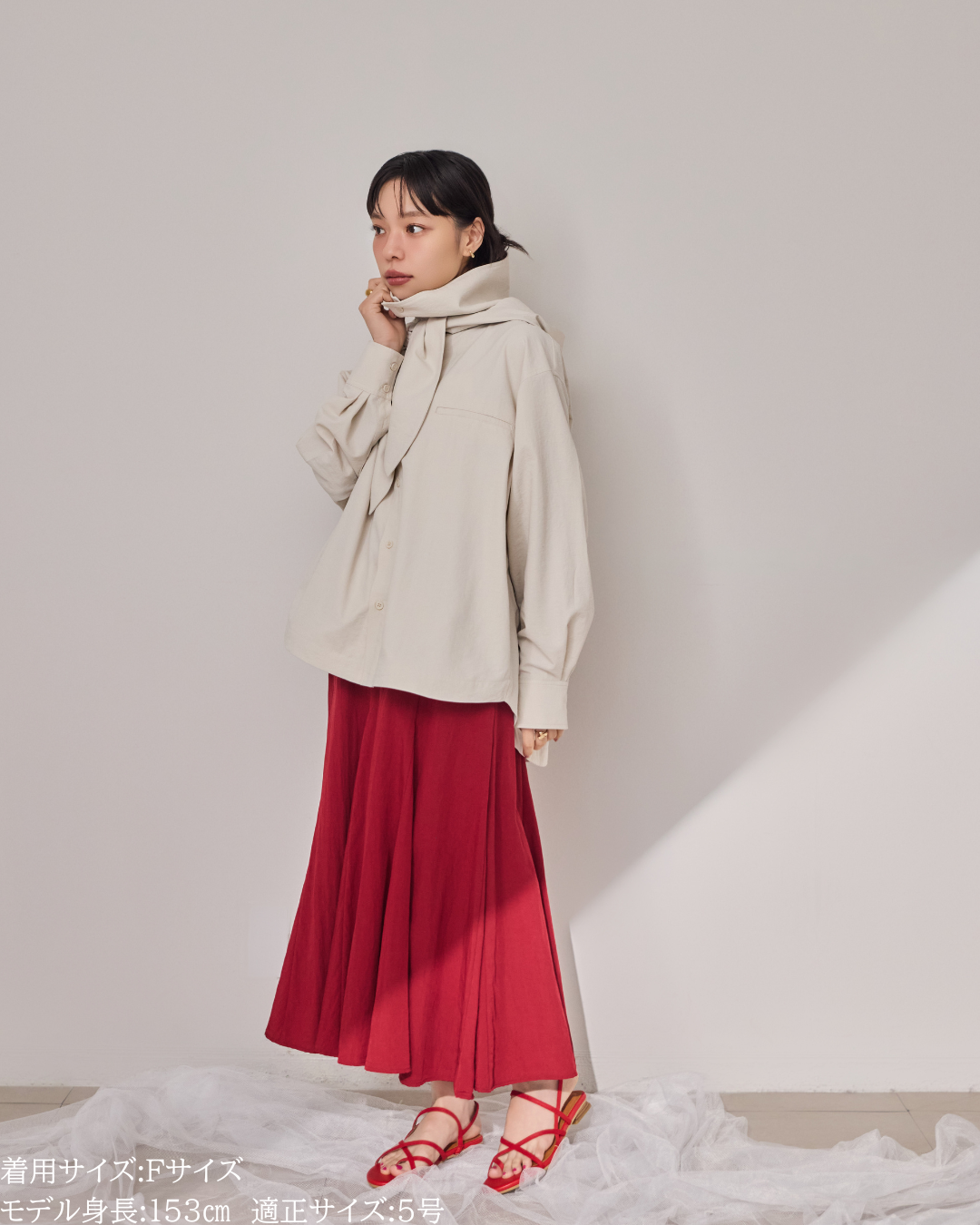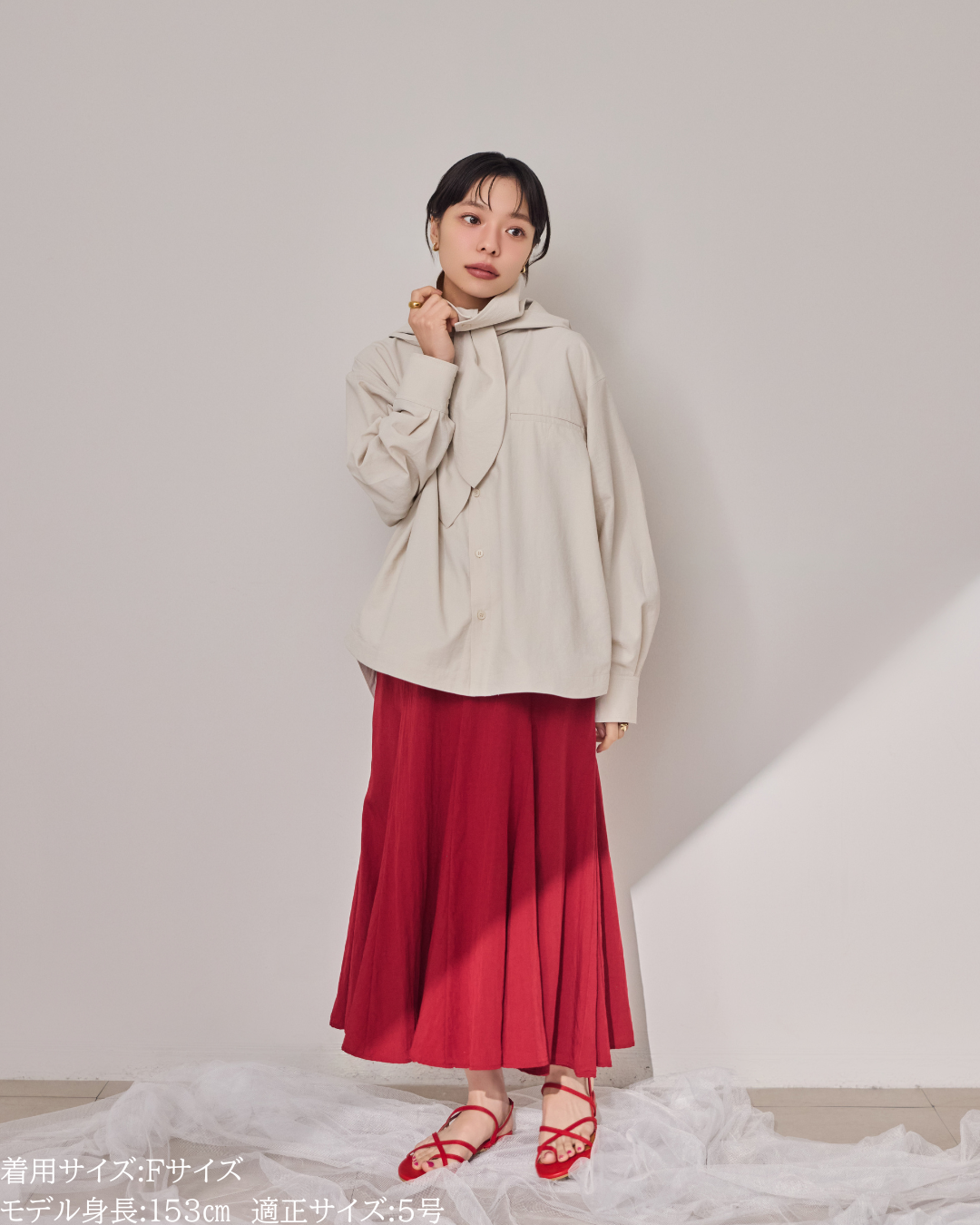 (F)袖丈は親指が隠れる長さで、着丈はヒップが隠れる長さで安心感があります。身幅もゆとりがあり、中にも着こめそうです。カジュアル感は控えめでシャツのようなきれいめな印象で着られました。生地も柔らかく動きやすいです。 -