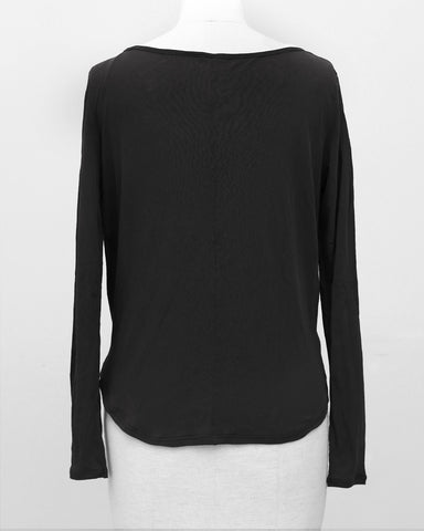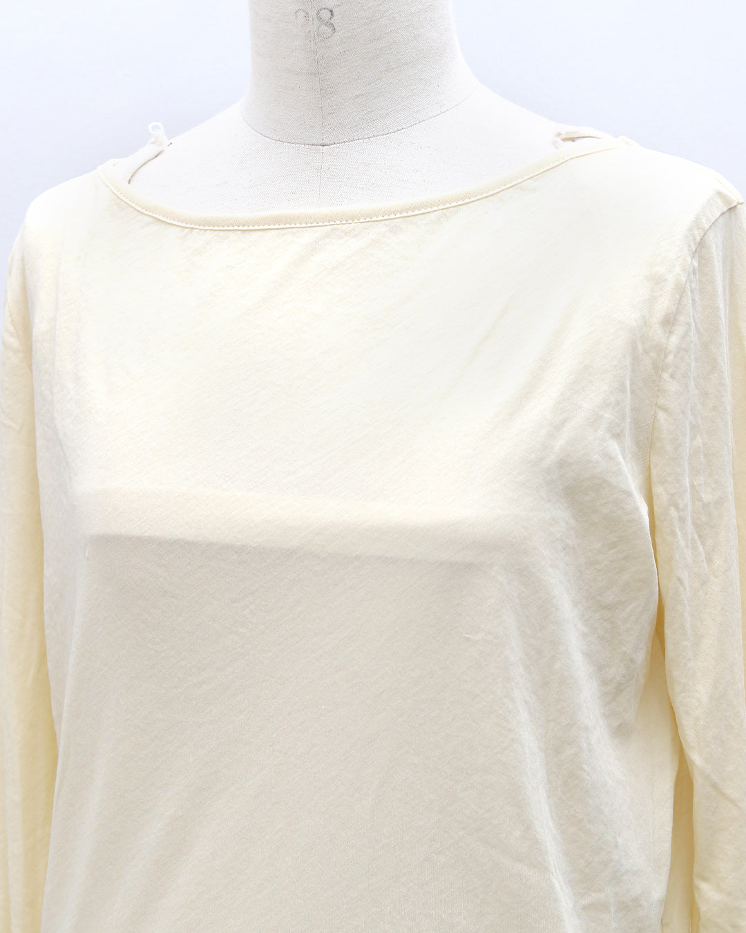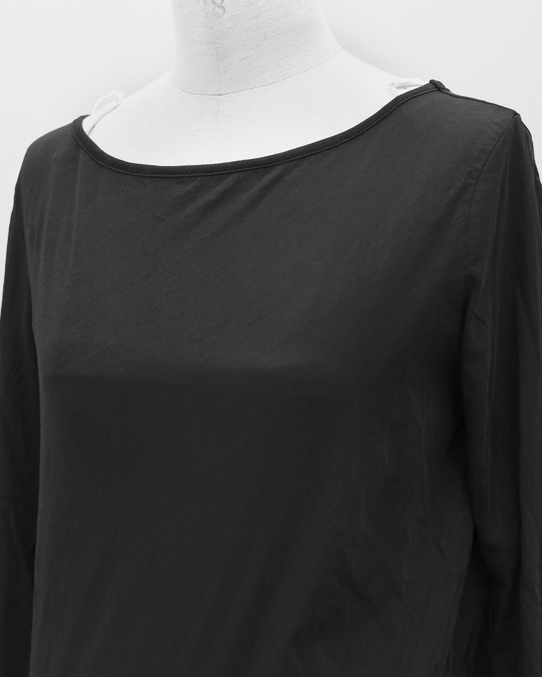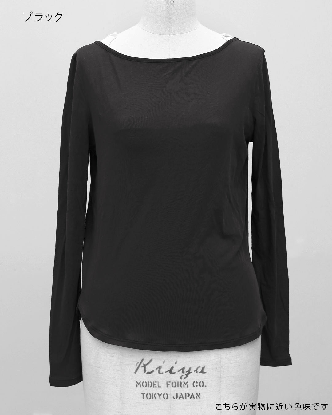 (F)袖丈は手首にくしゅっと弛みが出来る長さとなりましたが(私は身長に比べて腕が長い)フィット感があり手首でとまりますので腕の長短に左右されず着用できます。むしろ少し長めで弛みがあるほうがニュアンスがあって良いです。腕のフィット感はあるものの生地にシャリ感があるので腕にピッタリと張り付くような感じはなく、反対にアームホール部分はゆとりがあり脇に直に触れないので本当に着心地良いです。トップスのインナーとして裾をチラッと出して着用したり、メインのトップスにしてもどんなボトムスに合わせてもシアーの絶妙な抜け感がコーデを格上げしてくれます。襟はボートネックになっており1枚で着た時の女性らしいラインが際立ちます。
