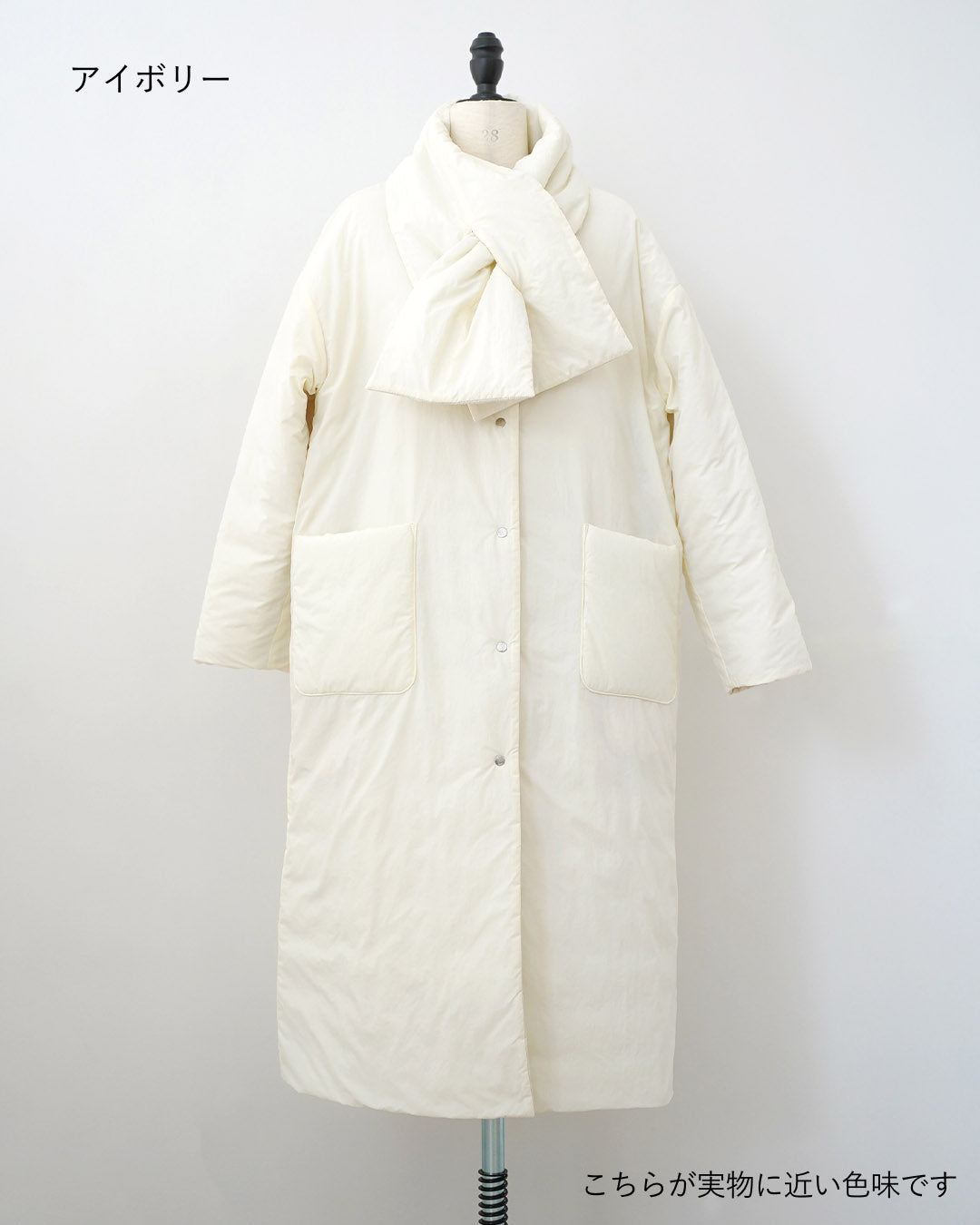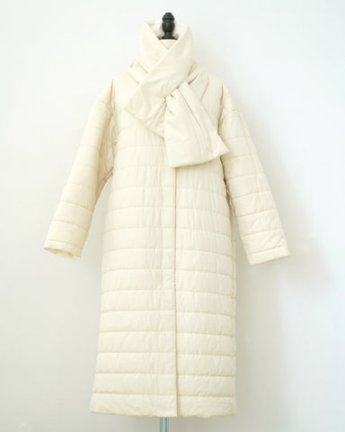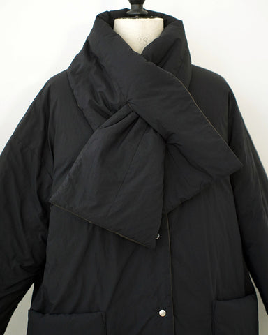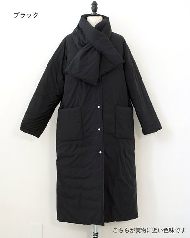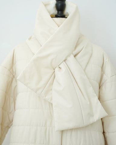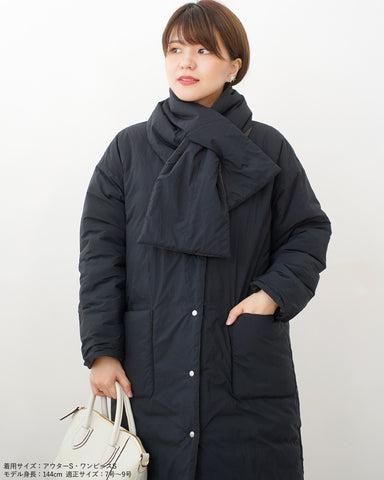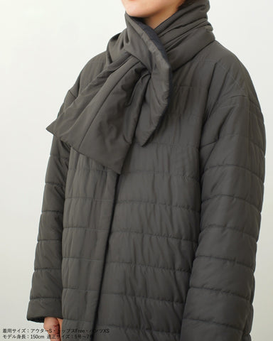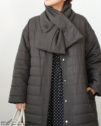 襟元は首元が綺麗に見えるようにノーカラー仕立て。付属の同素材のリバーシブルマフラーも巻いても、首元がかさばりません。