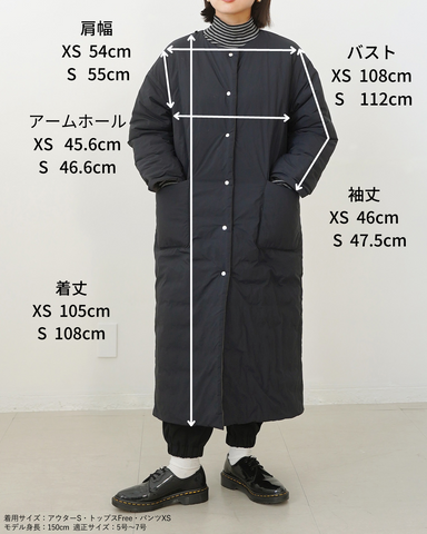 (XS/左)袖丈は手首ジャストです。着丈はふくらはぎの中間程度でした。とても軽いのにとても暖かいので子供と公園に行く時などは最適なコートだと思いました。個人的にマフラーを付けている時のシルエットが好みです。