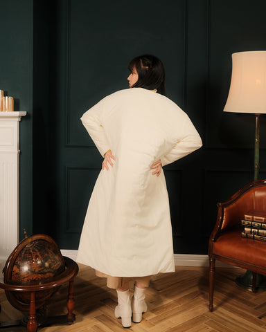 コートの合わせは、フラットなキルティングなしの表側はスナップボタン、キルティング面の裏側は隠しスナップにいたしました。どちらも上品な印象でご着用いただけます。