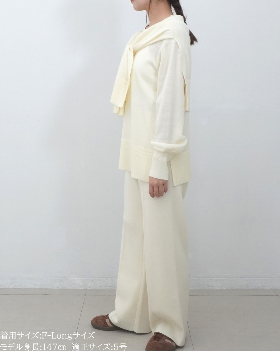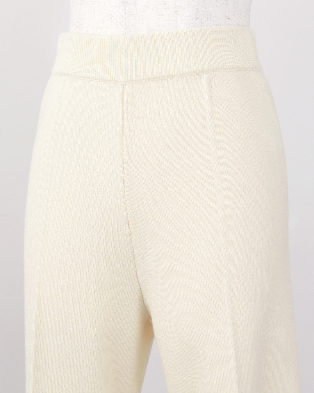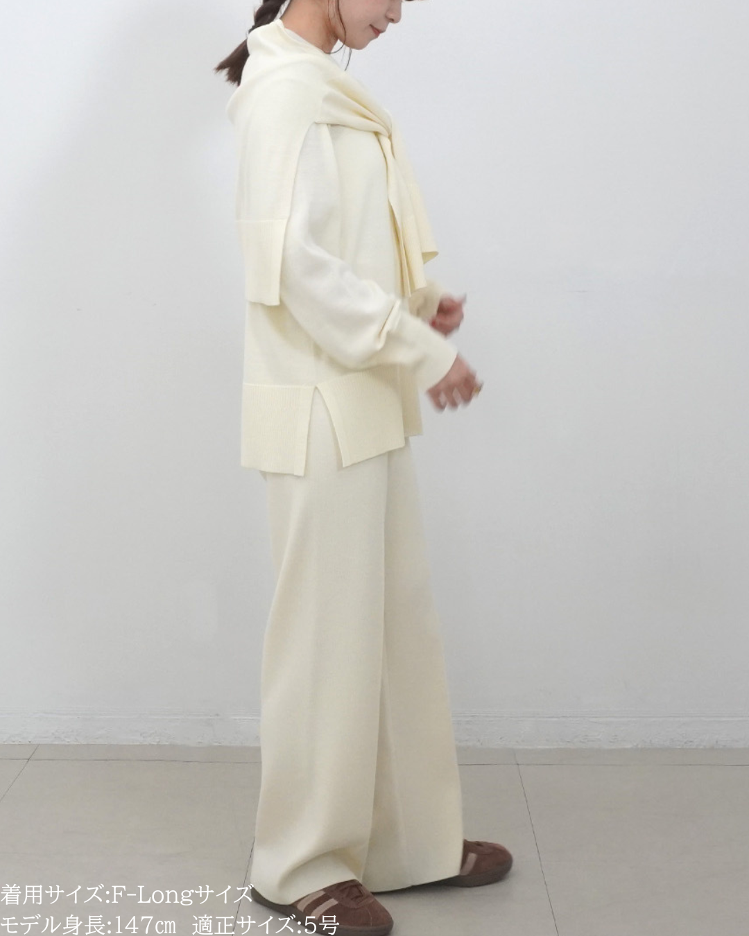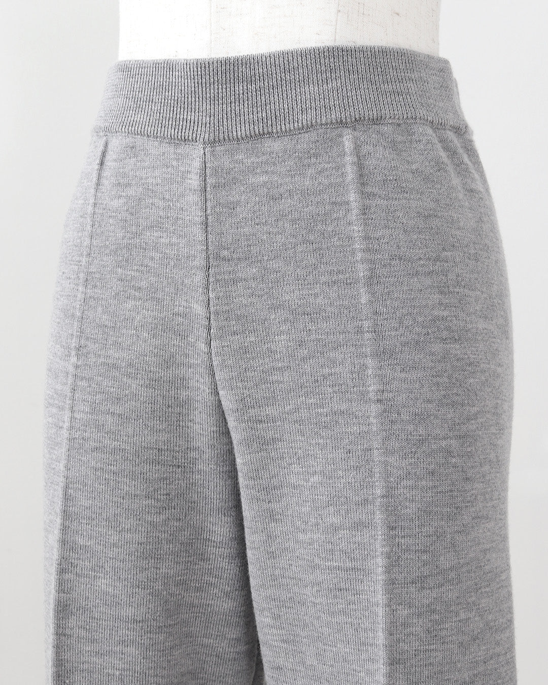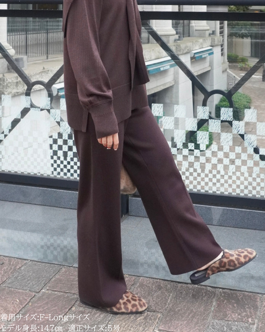 トップスと同じ糸・同じカラーで編み立てたウール100%の糸を使用。しっかりとした厚みのあるハイゲージで、肉感のおかげで身体のラインを拾いにくく、安心して穿ける素材感です。ウールならではの柔らかい風合いと暖かさはそのままに、“きれい見え”を叶える上品な表面感。冬の日常に寄り添う、頼れる1本です。