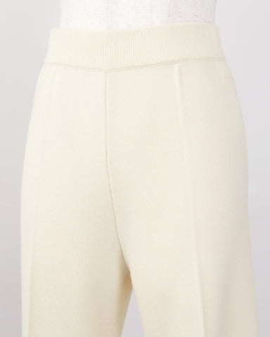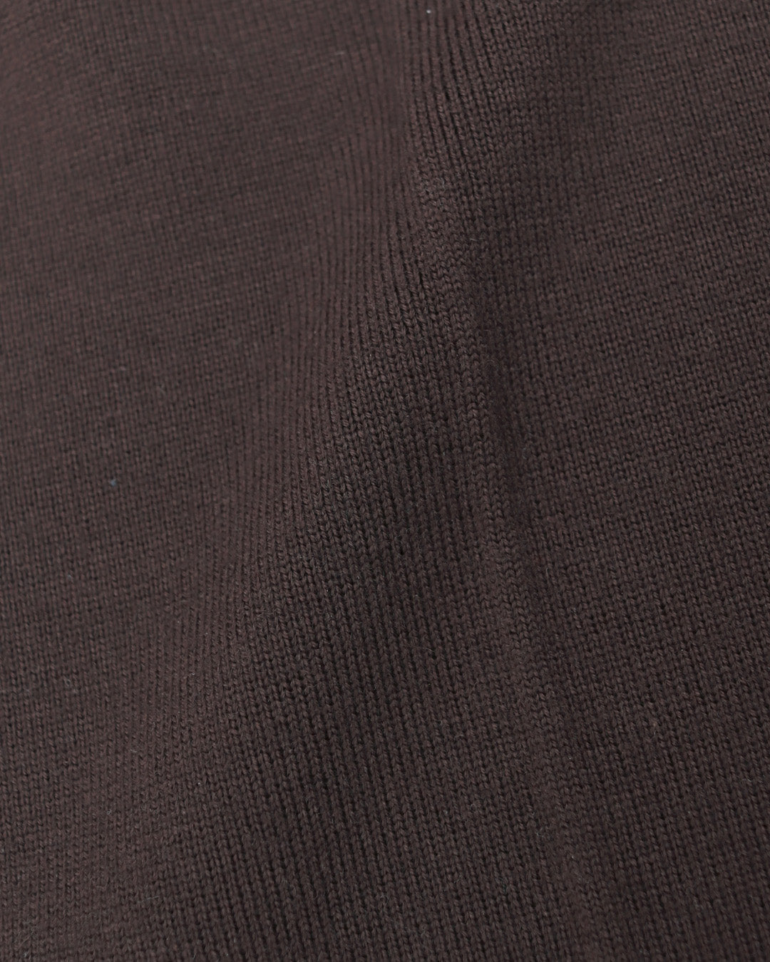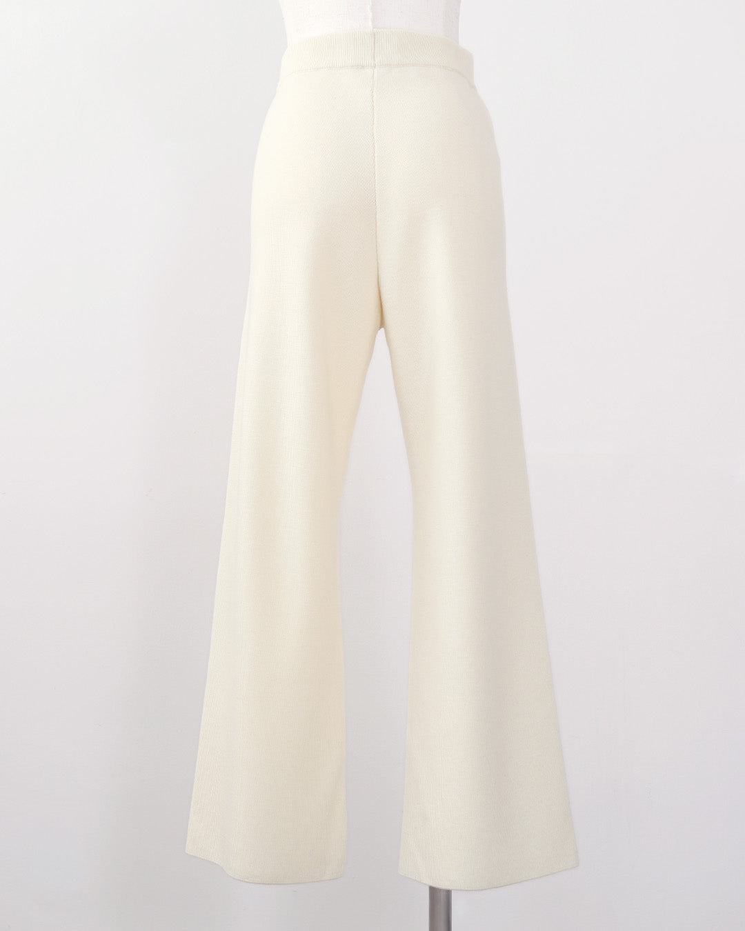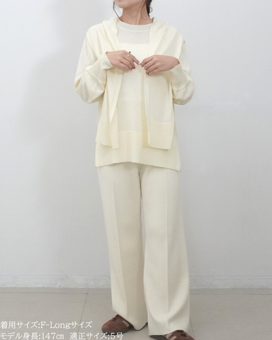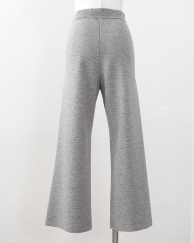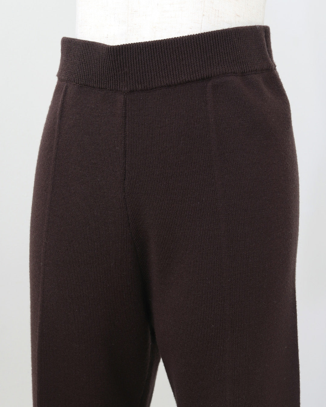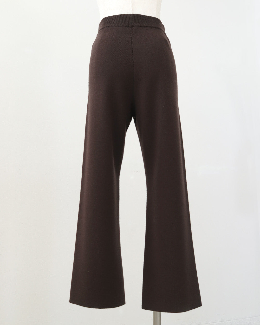 トップスと同じ糸・同じカラーで編み立てたウール100%の糸を使用。しっかりとした厚みのあるハイゲージで、肉感のおかげで身体のラインを拾いにくく、安心して穿ける素材感です。ウールならではの柔らかい風合いと暖かさはそのままに、“きれい見え”を叶える上品な表面感。冬の日常に寄り添う、頼れる1本です。