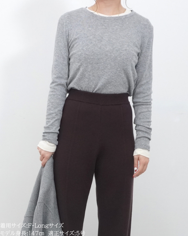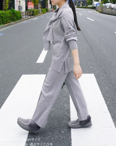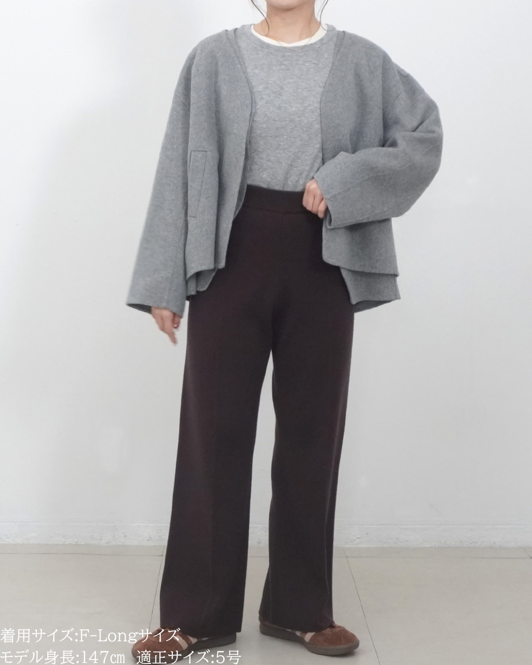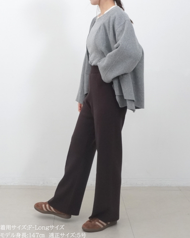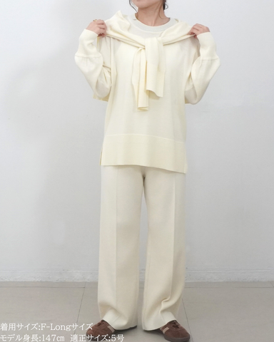 (F-Short/左)ウエストジャストサイズです。幅の広いホールド感のある総ゴムなのでお食事を楽しんだ後のサイズアップしたウエストにも苦しくなく着用できます。丈は足首ジャストになりました。素肌に着用しても私はチクチク感じることはありませんでした。むしろ柔らかくずっと着ていたくなるくらい楽なニットパンツです。