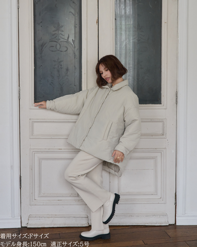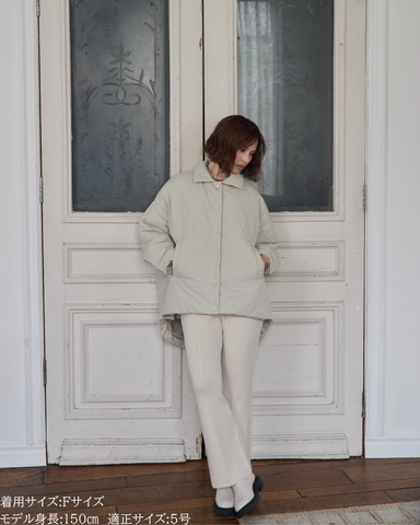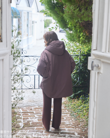 mone 144cm(通常3~5号、肩幅35cm、バスト78cm、袖丈43.5cm、裄丈61cm、ウエスト56cm、ヒップ84cm、股下61cm) (F)袖丈は親指が少し見える長さです。後ろ着丈が長めでおしりをすっぽりと隠してくれるシルエットのため寒い日でも暖かく着られます。身幅はゆとりがあり、ニットを着ても着膨れしなさそうです。ボリューム感はありながら軽いコートでしっかり防寒対策できるアイテムです。