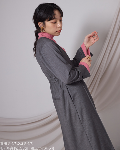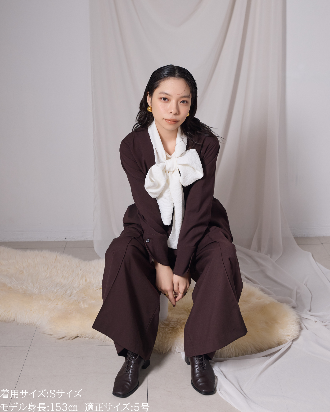 素材は ポリエステル60%、レーヨン30%、ウール8%、ポリウレタン2%。梳毛調(そもうちょう)素材とは、ウールを細く長く紡いだ「梳毛糸(そもうし)」のような滑らかさとハリ感を再現した生地のこと。表面にツヤがあり、毛羽立ちにくく、上品な印象を保ちながらもシワになりにくいのが特徴です。ツルっとした肌あたりで着心地がよく、長時間着ていてもストレスフリー。カラーは、2色展開。 • グレー:知的で洗練された印象。モノトーンや寒色系のアイテムと合わせて、都会的なムードに。 • ブラウン:柔らかさと深みを感じるトーン。ベージュやアイボリーとの相性がよく、秋冬の温かみある着こなしにぴったり。シーズンを通して着回しやすく、きちんと感とリラックス感を兼ね備えた万能素材でお作りしています。