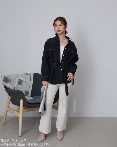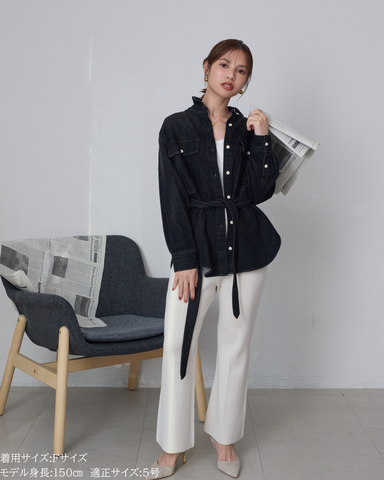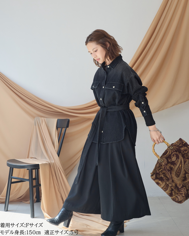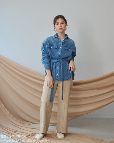 共生地ベルトでウエストマーク。ボトムにワイドパンツやプリーツスカートを合わせて、縦ラインを強調。小柄さんでもバランス良くまとまります。