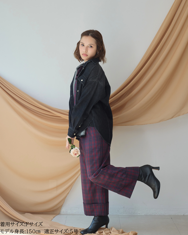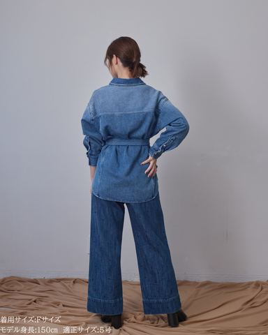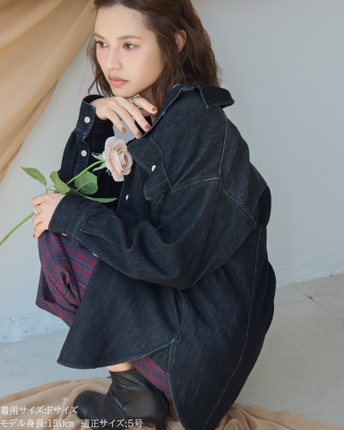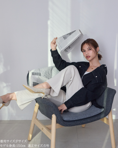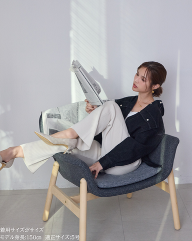 (F)袖丈は手首がしっかり隠れる長さ(私は身長に比べて腕が長いタイプです)となりました。着丈はヒップ下までとなり細めパンツと合わせた時の気になるヒップを隠してくれますし、ラウンドしているので前インした場合でもバランスよく着用できます。デニムですがゴワつきなく、肩周りも動きやすいです。