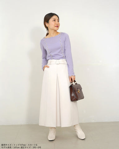 (XS)着用できましたが、ウエストヒップともに小さいためSを選びます。ジャストサイズのほうがプリーツがきれいに出るため、特にヒップサイズを基準に選ぶことをおすすめします。
