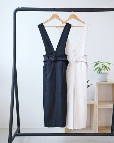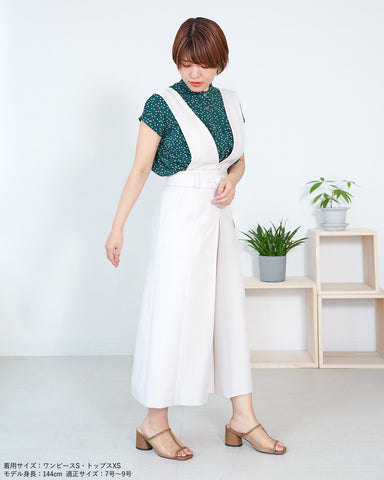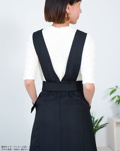 (左XS)ウエスト63cmの私ですとやや気が引き締まるサイズ感です。腰の張りは無い体型のためXSサイズを着用するとかなり着痩せして見えますが、着丈もコンパクトになりリラックス感はありません。バスト83cmの私でも上身頃のサスペンダーはパツパツになることもなく、さらに短くも調節可能なため上半身が華奢な方にも着用いただけると思います。