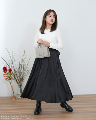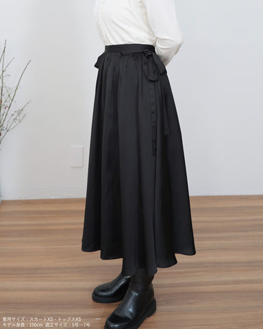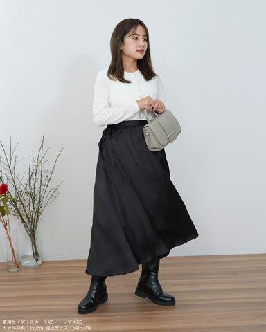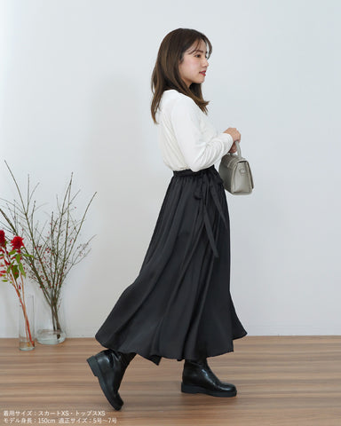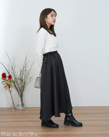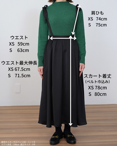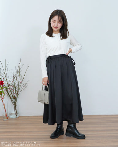 (XS/画像)ジャストサイズです。丈はくるぶし上くらいです。ふんわりとしたシルエットですので、合わせるトップスは厚手のものより中肉までの厚さの方がシルエットが綺麗に出ます。厚手のトップスですとウエスト後ろはゴムになっておりますが、ウエスト周りのふんわり感が大きく出てしまいますので、その場合はワンサイズ上げられた方がシルエット変わらず着用できそうです。リボンの結び方次第では何通りものコーデが完成しますので、オリジナルの結び方でお楽しみください。