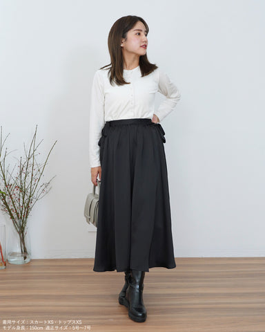 (XS)普段はSサイズを選ぶことが多いのですが、今回はXSを選びます。ウエストはゴム入りのため苦しさなどなく、着丈は足首が見える程度です。XSよりもギャザー分量が少ないためコンパクトな印象のXSが好みでした。